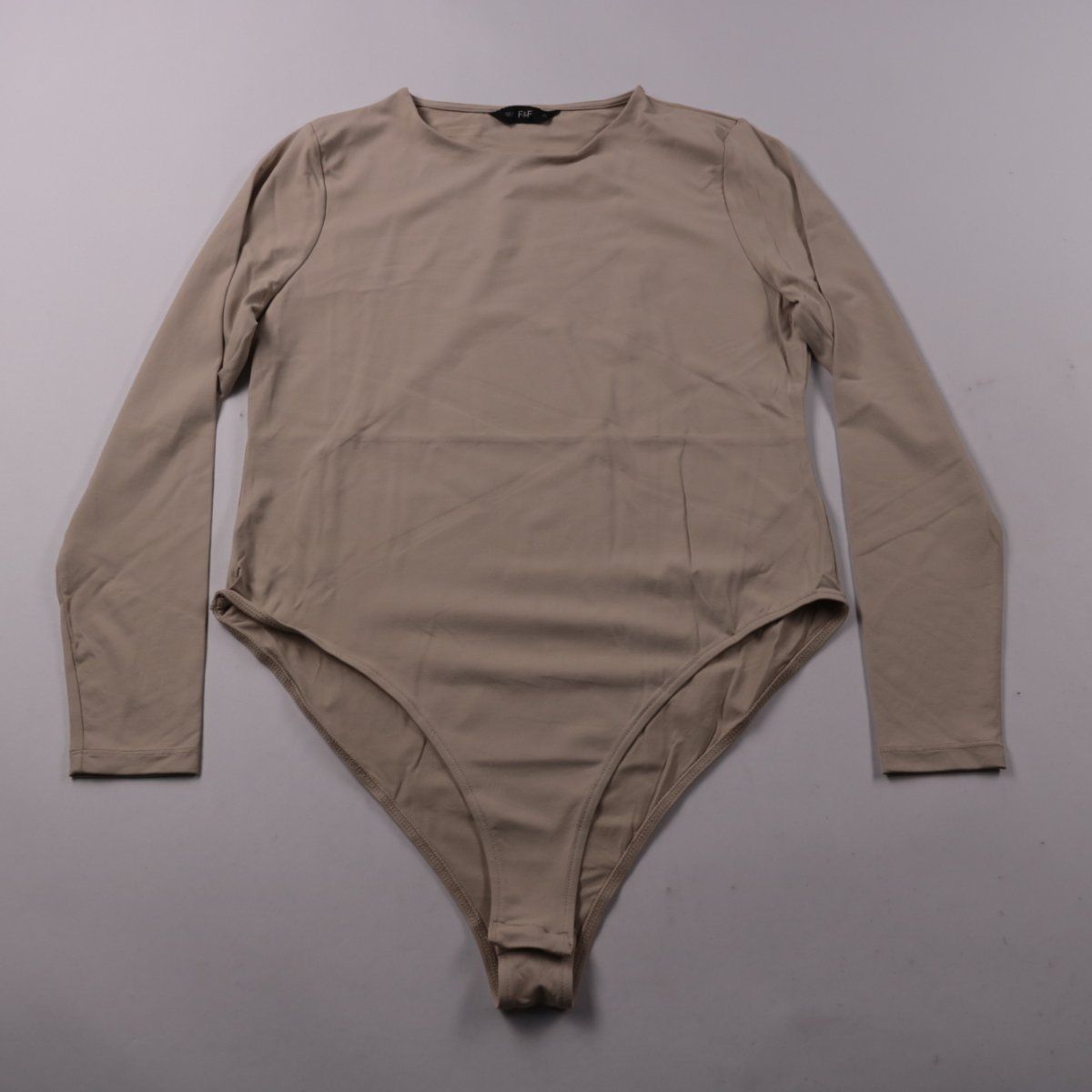 Женское боди F&F бежевого цвета с длинным рукавом и круглым вырезом. Подойдёт как базовый слой под жакет, свитер или кардиган в повседневных образах. Плотно прилегает и не выбивается из-под одежды.