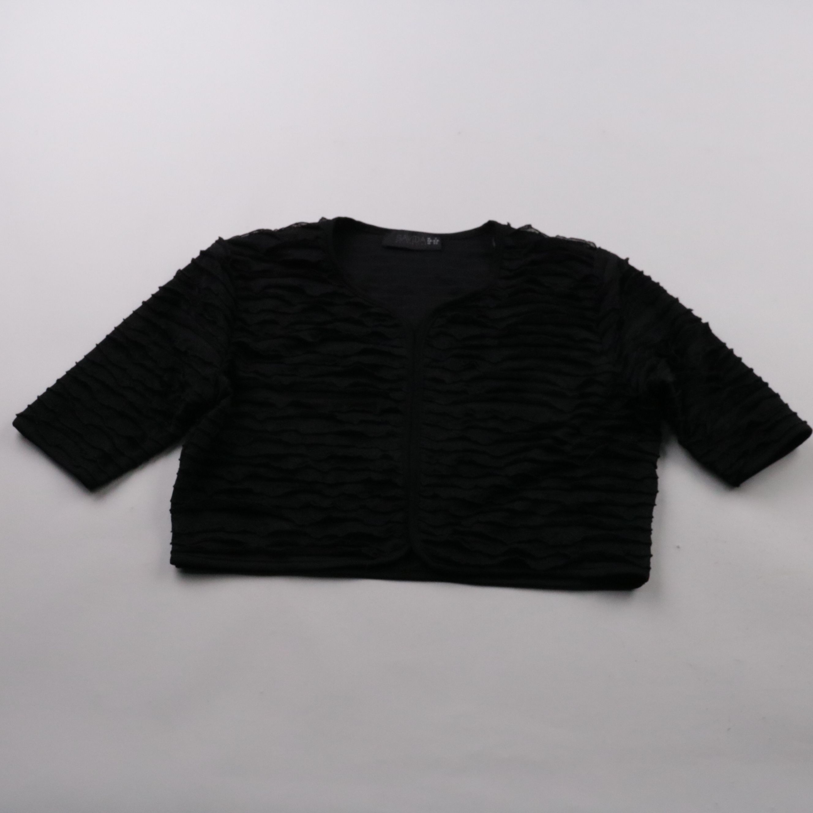 Женский укороченный пиджак Savida чёрного цвета с фактурной отделкой и рукавом 3/4. Подойдёт для вечернего выхода или в качестве накидки поверх платья и топа. Материал эластичный и почти не мнётся, удобно брать с собой.