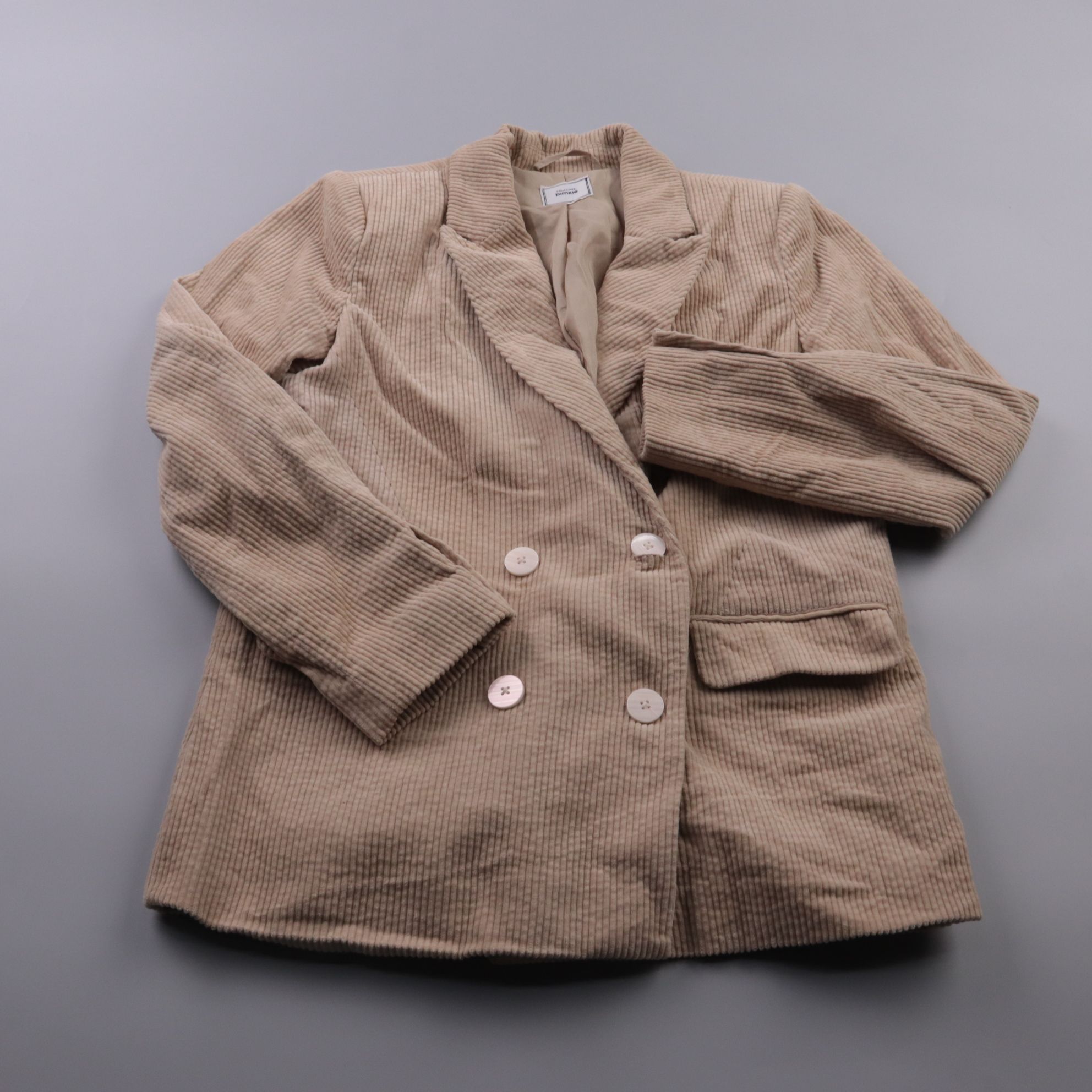 Женский двубортный вельветовый пиджак Pimkie бежевого цвета с подкладкой. Подойдёт для офиса и повседневных образов в демисезон, хорошо сочетается с джинсами и брюками. Плотный материал держит форму, а карманы добавляют практичности.