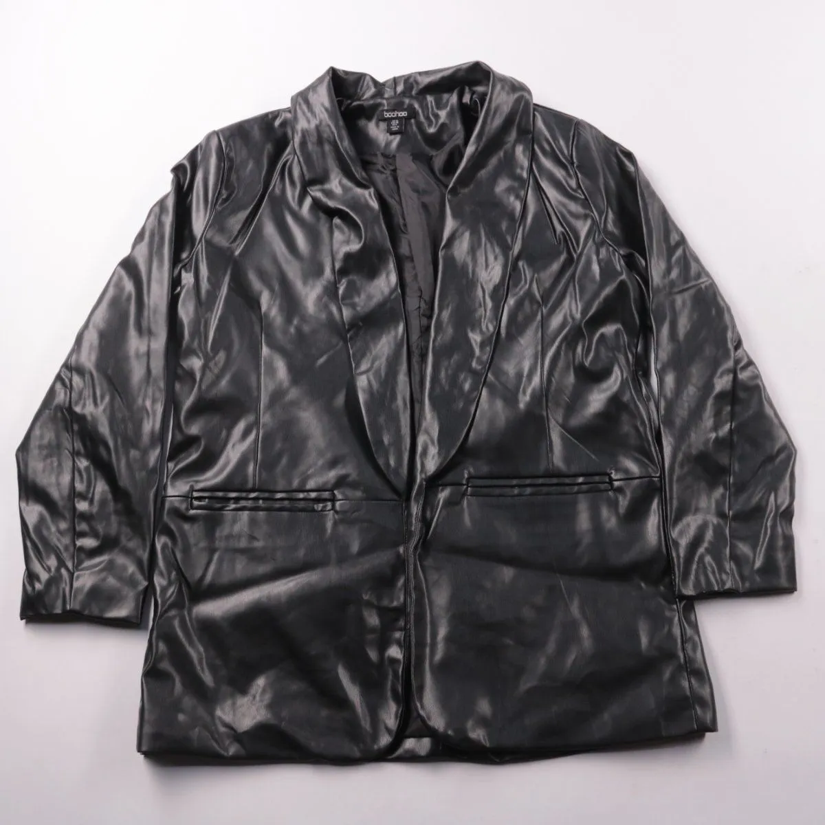Женский пиджак Boohoo из чёрной экокожи с лацканами и прорезными карманами. Подойдёт для повседневных и более строгих образов в прохладную погоду. Материал практичен в уходе — легко протирается и быстро приводит в порядок внешний вид.