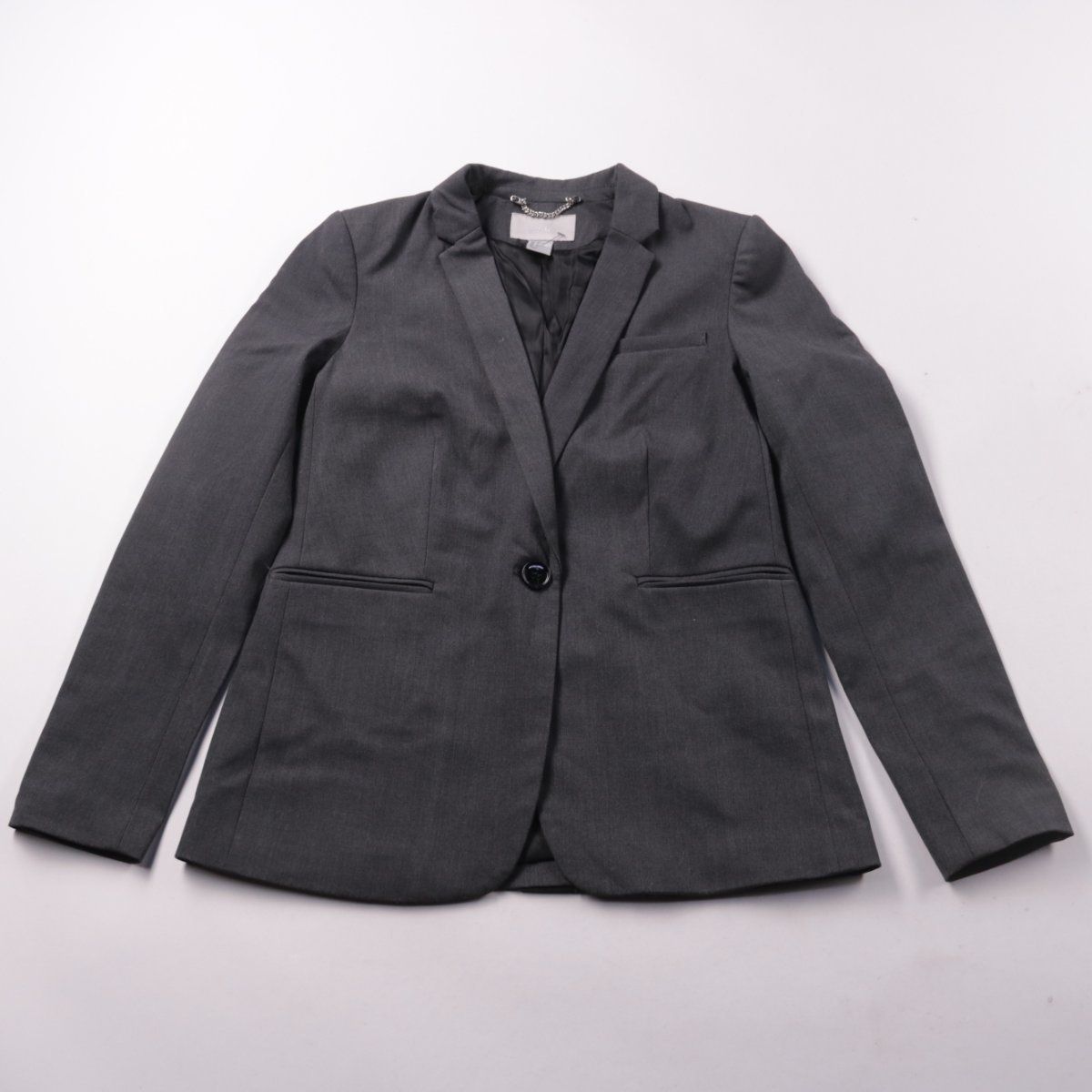 Женский пиджак H&M графитового цвета, приталенный, на одной пуговице с лацканами и карманами. Подойдёт для офиса и деловых встреч, а также для более нарядных образов с топом или блузой. Практичный плюс — универсальный цвет и подкладка, комфортно носится и легко сочетать.