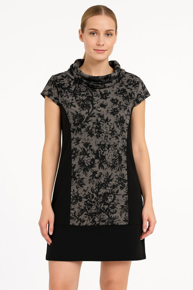 Повседневное платье Milke прямого кроя с коротким рукавом и мягким воротником-хомутом. Серо-чёрная вставка с цветочным принтом делает образ спокойным и аккуратным — подойдёт для офиса, прогулок и встреч. Практично тем, что легко сочетается с плотными к...