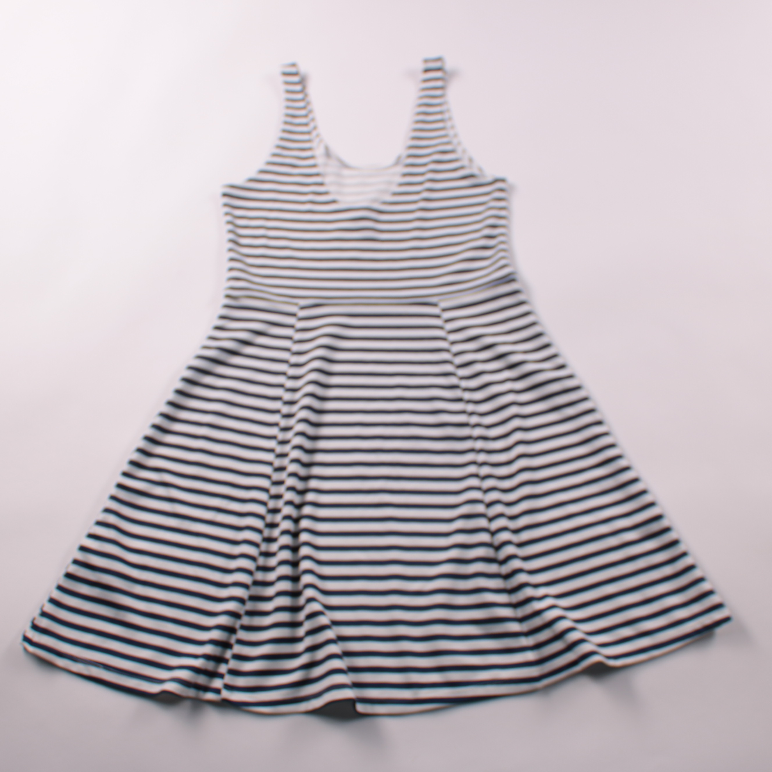 Женское повседневное платье H&M в черно-белую полоску, без рукавов, с расклешенной юбкой. Подойдет для прогулок и отдыха в теплую погоду, легко сочетается с кедами или сандалиями. Материал тянется и комфортно садится по фигуре.