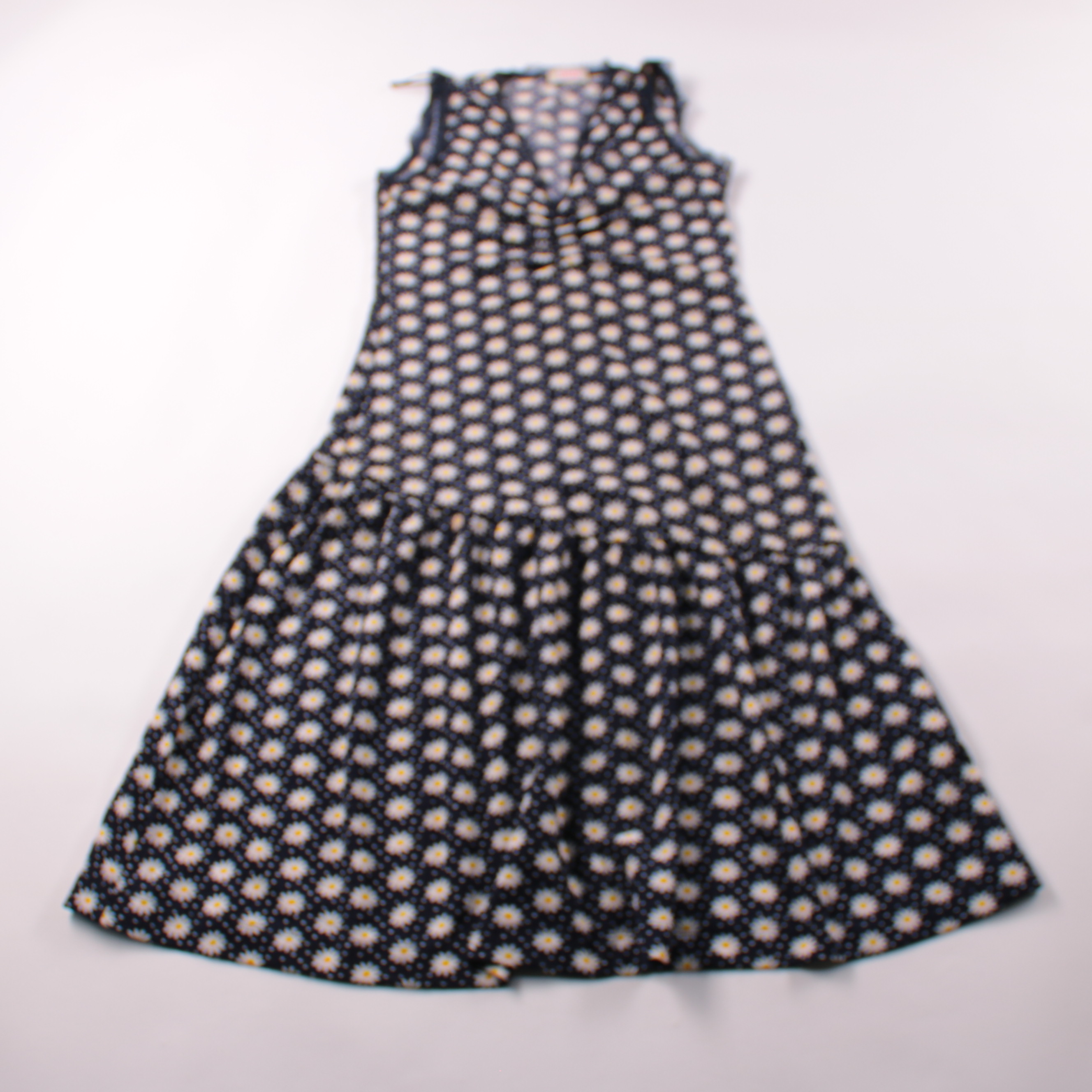 Повседневное платье Savida тёмно-синего цвета с принтом ромашек и V-образным вырезом. Подойдёт для летних прогулок и отдыха, лёгкий расклешённый низ выглядит аккуратно и женственно. Материал с эластаном немного тянется и комфортно садится по фигуре.