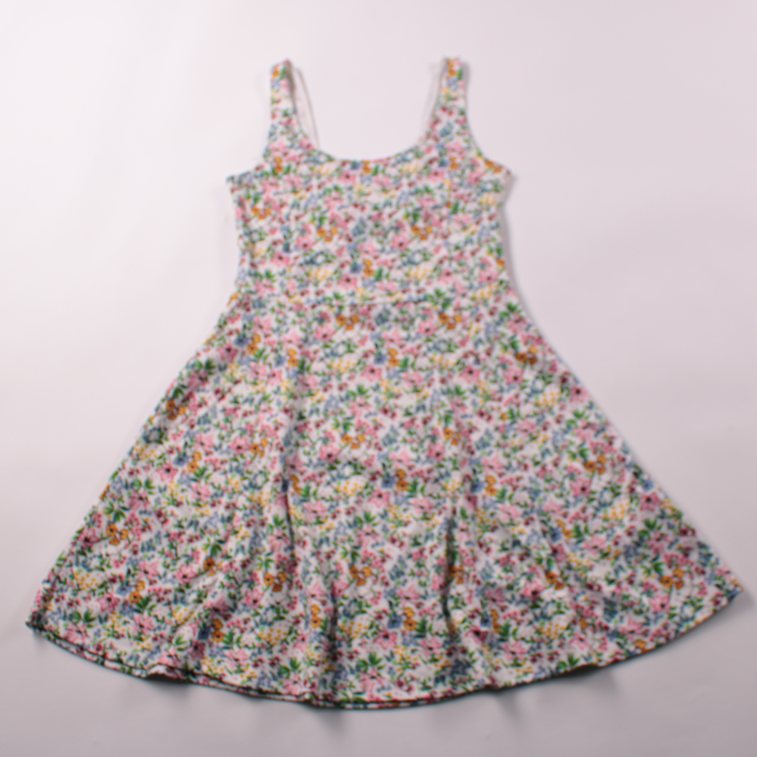 Лёгкое повседневное платье с цветочным принтом на широких бретелях и расклешённой юбкой. Подойдёт для прогулок и отдыха в тёплую погоду, хорошо сочетается с кедами или сандалиями. Ткань эластичная и почти не мнётся, удобно носить целый день.