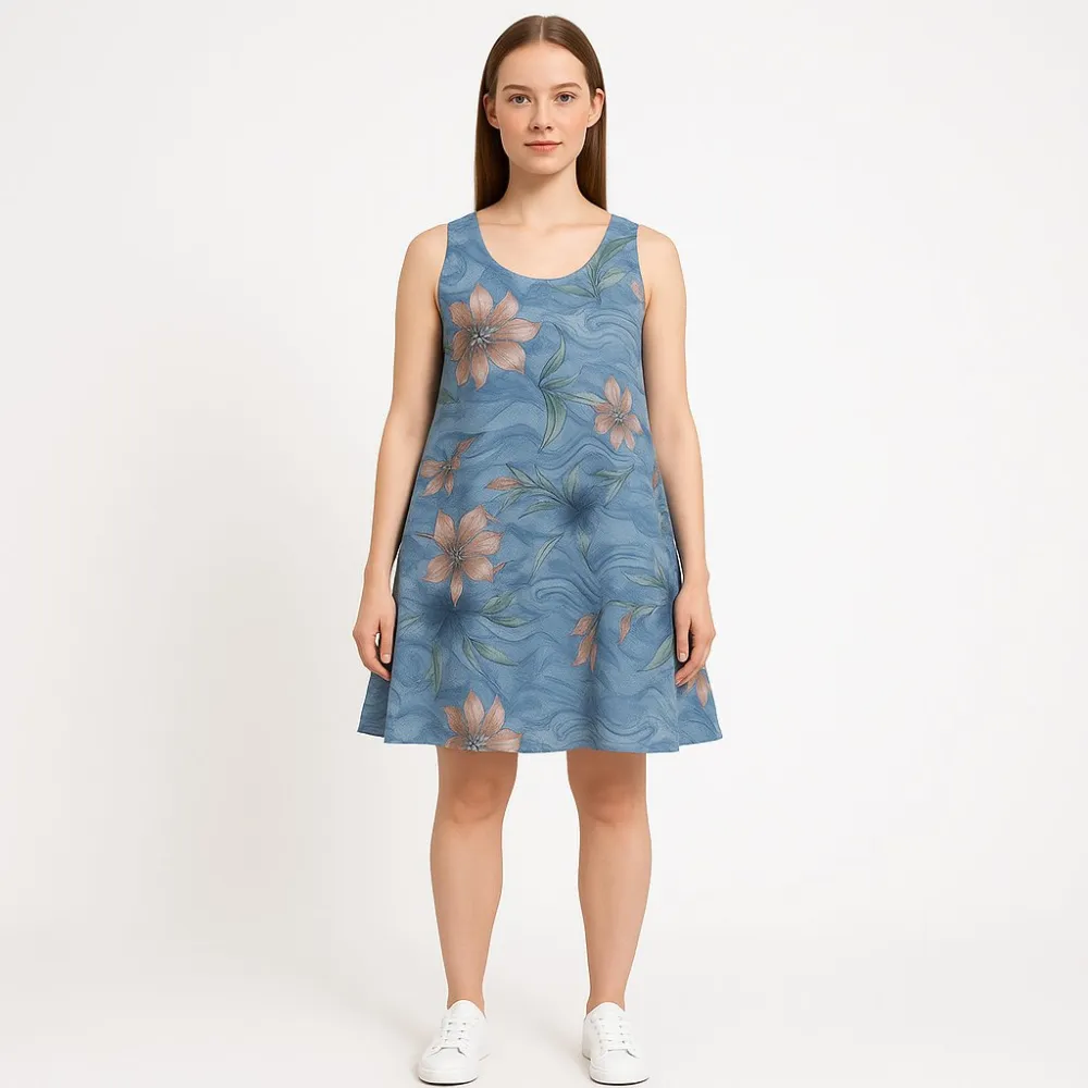 Летнее платье Carnaby без рукавов, выполнено из трикотажного материала голубого цвета с цветочным принтом. Подойдёт для повседневных прогулок и отдыха в тёплую погоду. Лёгкая ткань и свободный крой обеспечивают комфорт и не сковывают движения.