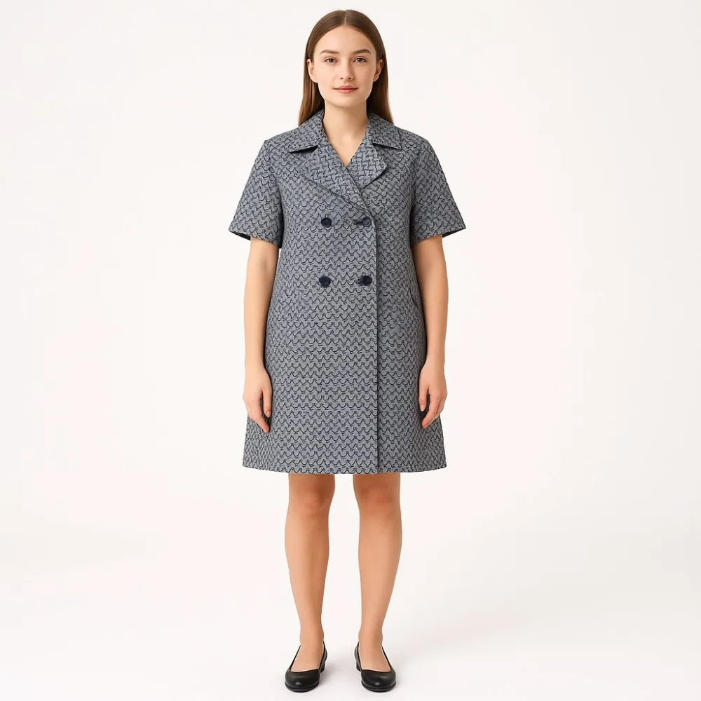 Повседневное платье Savida в синем цвете с двубортной застёжкой и воротником, подойдёт для офиса и городских образов. Плотная фактурная ткань держит форму, а подкладка делает посадку более комфортной.