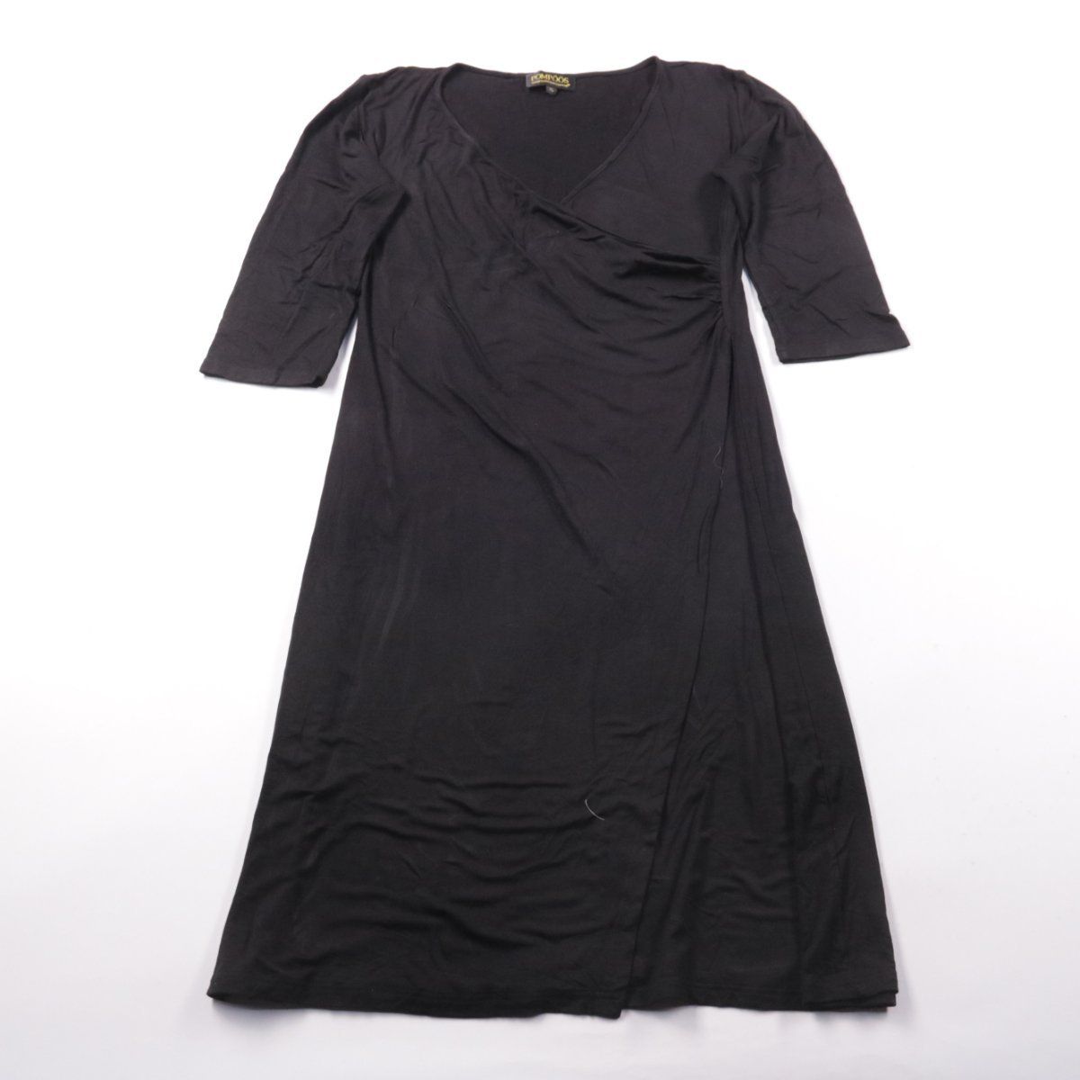 Платье POMPÖÖS design by Harald Glööckler чёрного цвета, трикотажное и эластичное, с запахом и V‑образным вырезом, рукав 3/4. Подойдёт для повседневных образов и на выход, легко комбинируется с туфлями или ботильонами. Практичный плюс — мягкая вискоза комфортна в носке и почти не мнётся.