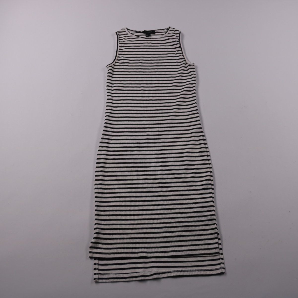 Повседневное платье Atmosphere в чёрно-белую полоску, без рукавов, из мягкого трикотажа в рубчик. Подойдёт для лета и тёплой погоды, удобно носить каждый день с кедами или сандалиями. Тянущаяся ткань хорошо садится по фигуре и не сковывает движения.