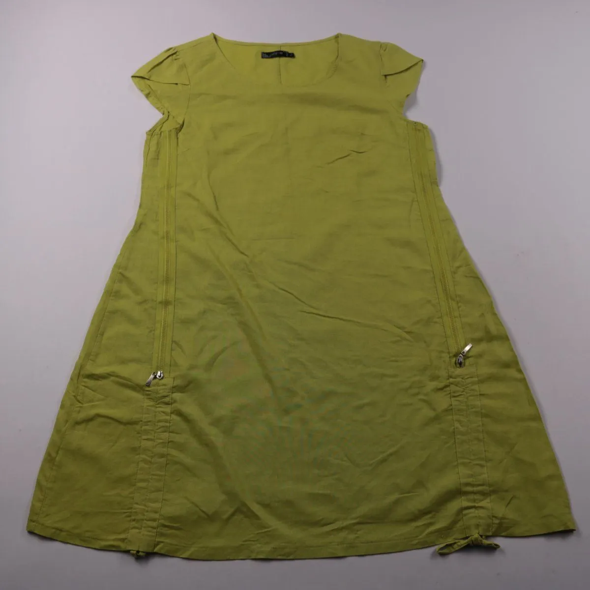 Повседневное платье A.C.B салатово-зелёного цвета с коротким рукавом и прямым/слегка расклешённым силуэтом. Подойдёт для тёплой погоды и городских прогулок, по бокам есть молнии и завязки для регулировки посадки. Смесь рами и хлопка хорошо дышит и комфортна в носке.