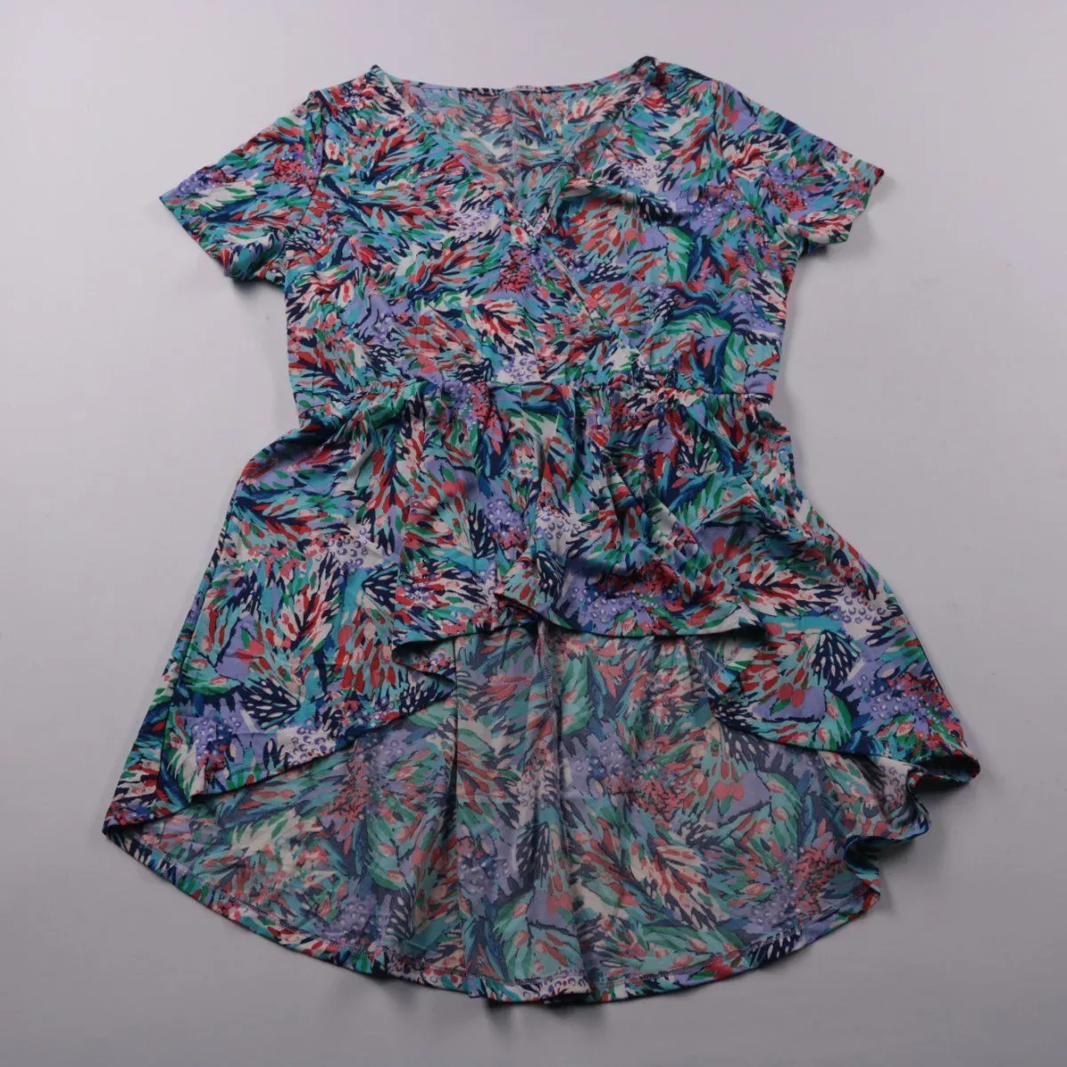 Женское повседневное платье с коротким рукавом и V-образным вырезом, с ярким разноцветным принтом. Подойдёт для лета, прогулок и отдыха благодаря лёгкой струящейся ткани и свободному крою. Практично тем, что не мнётся и хорошо смотрится без сложной укладки.