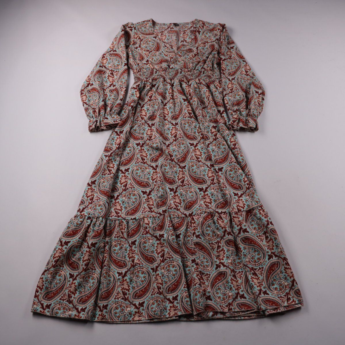 Повседневное платье SHEIN длины миди/макси с принтом пейсли и длинными рукавами на резинке. Подойдёт для прогулок и повседневных образов благодаря эластичной линии талии и свободной юбке. Практично тем, что ткань с добавлением эластана слегка тянется и легко стирается в машине.