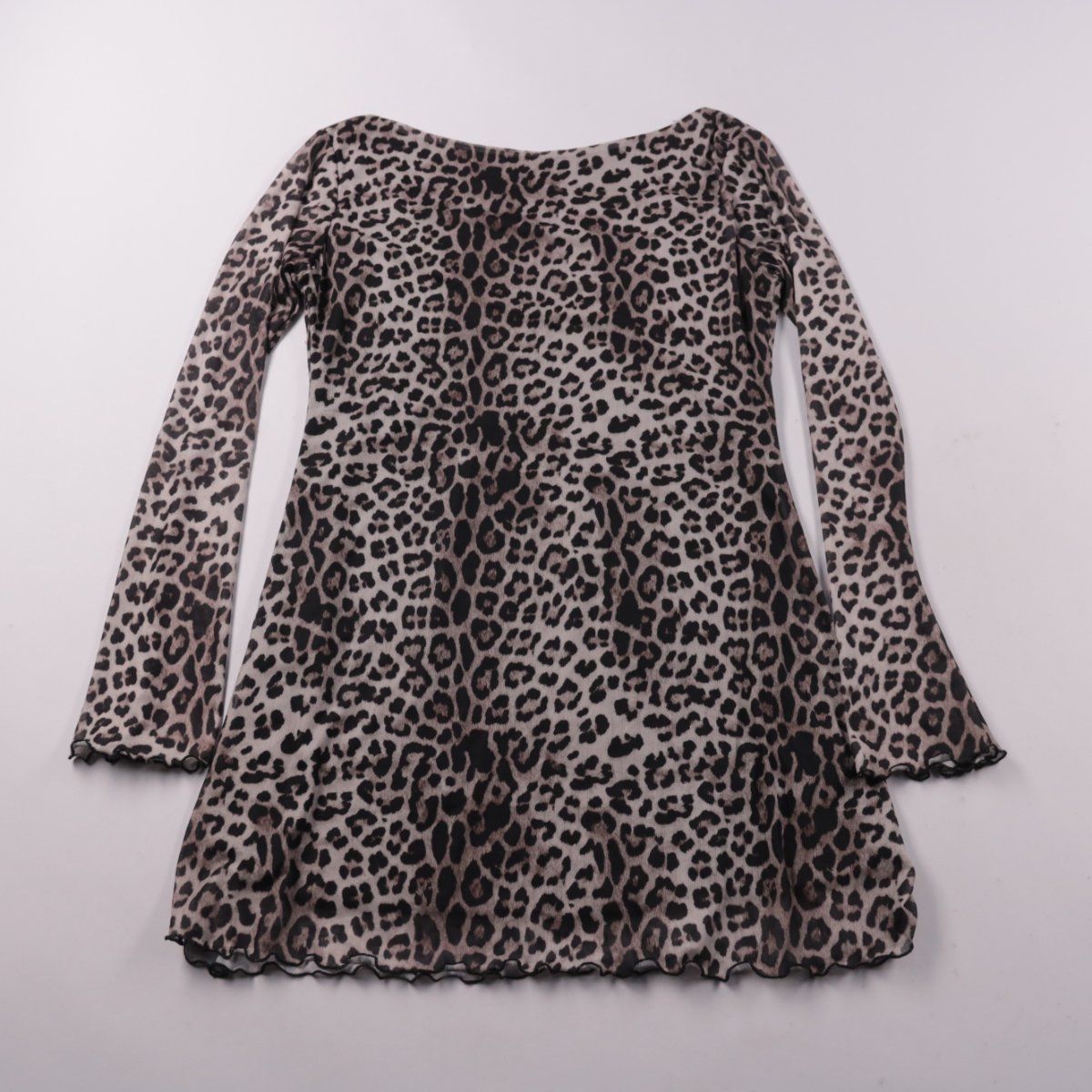 Женское повседневное платье с леопардовым принтом, длинными рукавами и фигурной волнистой окантовкой по краю. Подойдёт для прогулок и встреч, когда хочется акцента в образе без лишних деталей. Лёгкий полиэстер быстро сохнет и почти не мнётся.