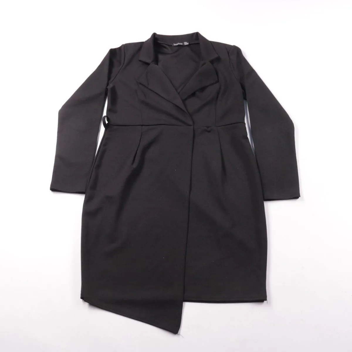 Чёрное платье-пиджак Boohoo с длинным рукавом и лацканами, выполнено в стиле запаха с асимметричным низом. Подойдёт для офиса, мероприятий и вечерних выходов, когда нужен строгий силуэт. Ткань с эластаном слегка тянется и комфортнее садится по фигуре.