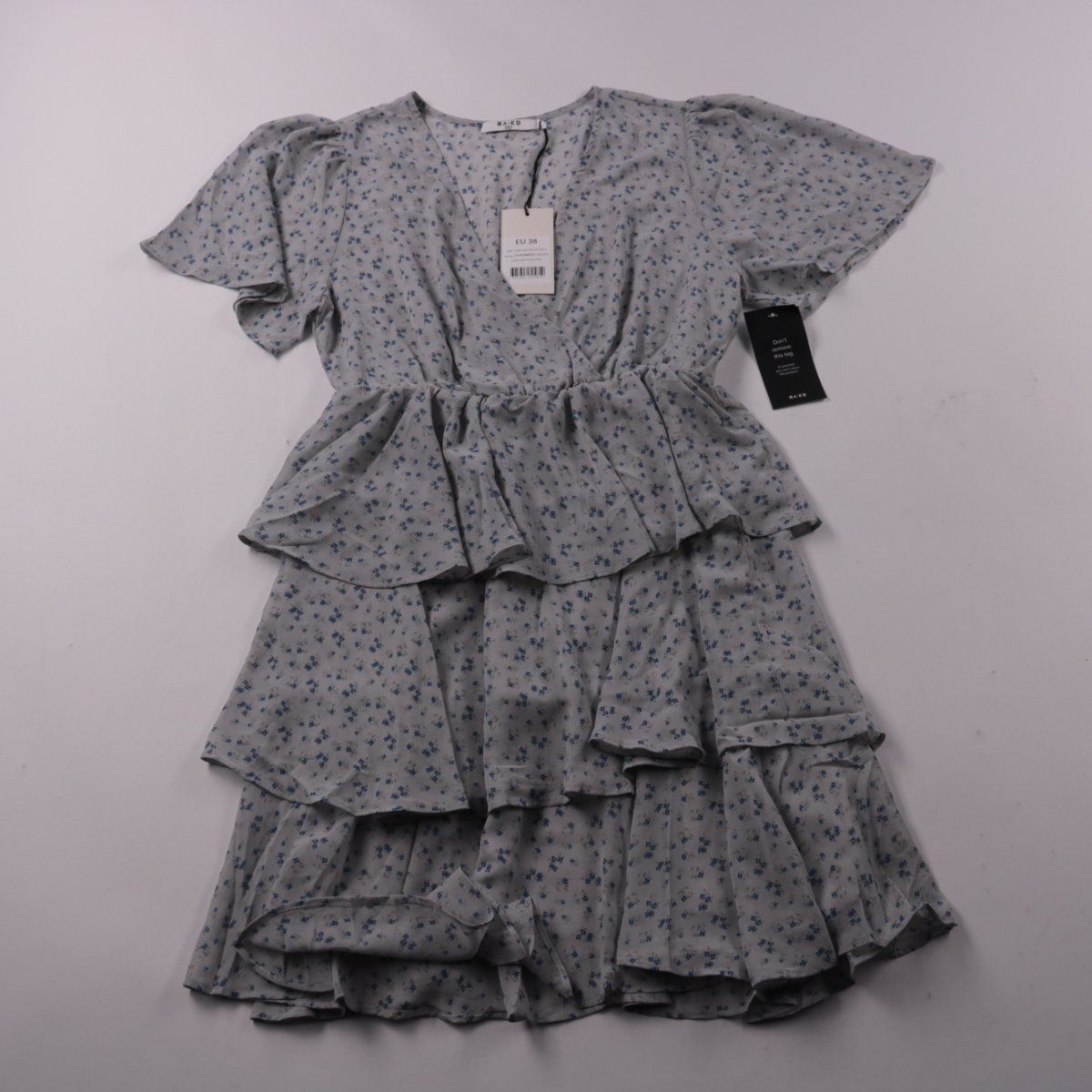 Повседневное платье NA-KD серого цвета с мелким цветочным принтом и V-образным вырезом. Короткие рукава и многоярусная юбка с воланами делают модель удобной для тёплой погоды и прогулок. Лёгкая ткань на основе полиэстера меньше мнётся и проста в уходе.