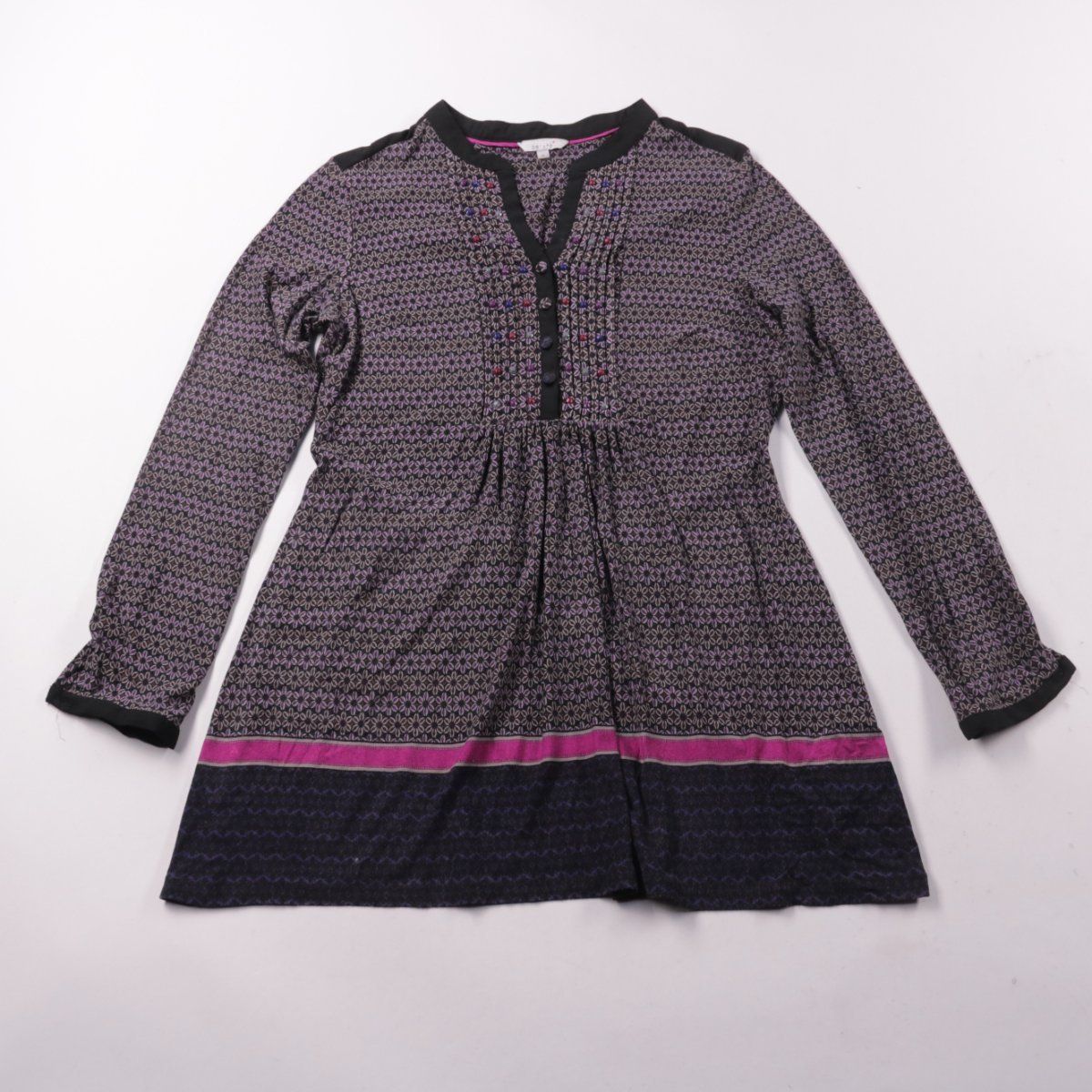 Повседневное платье Per Una с мелким геометрическим принтом и планкой на пуговицах. Подойдёт для города и офиса в прохладную погоду благодаря длинным рукавам и мягкой ткани. Преимущество — эластичный материал и завязка на талии для регулировки посадки.