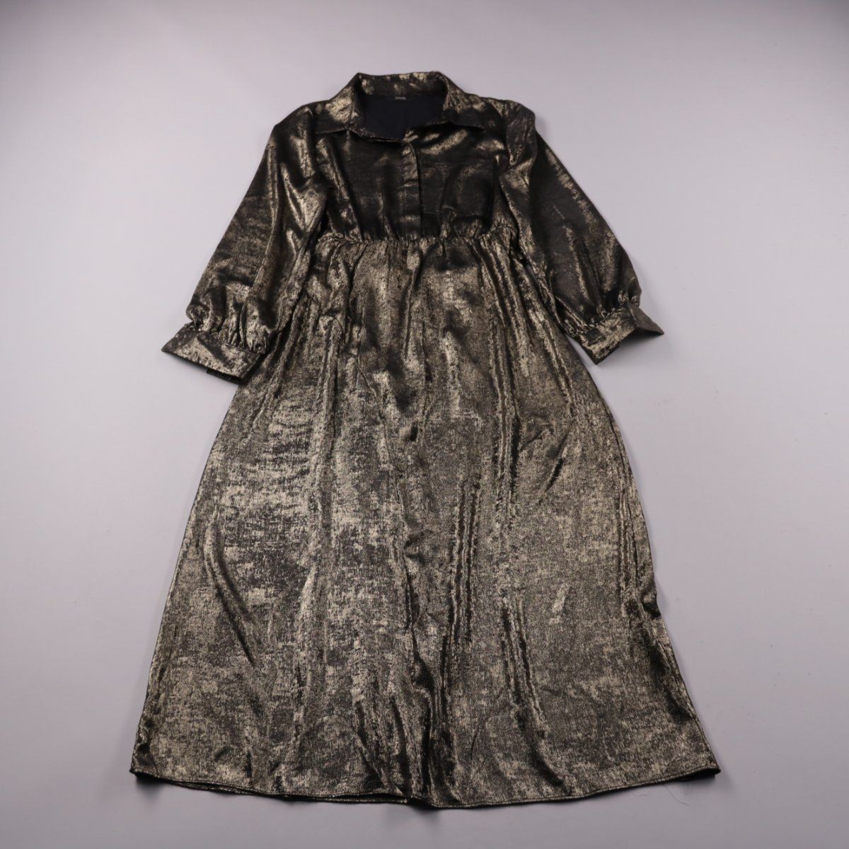 Вечернее платье George с металлизированным черно-золотистым покрытием и рубашечным верхом. Подойдет для праздника, ужина или выхода в прохладный сезон. Длинный рукав делает модель практичнее для носки без накидки.