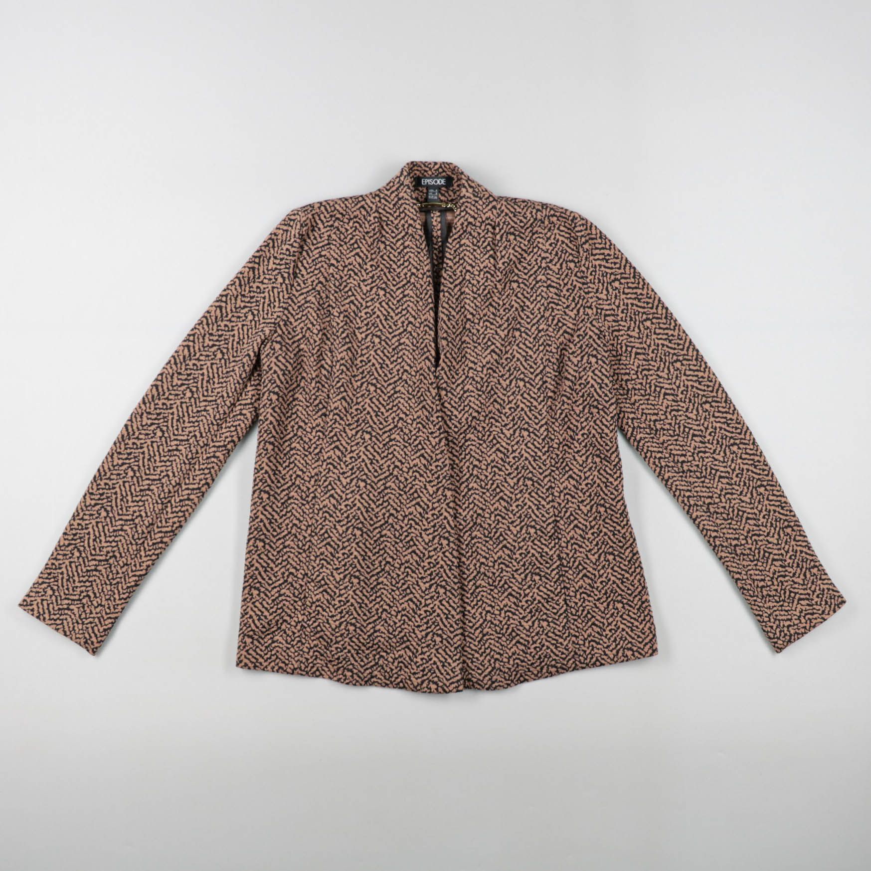 Женская блузка Episode с длинным рукавом и мелким графичным узором в бежево-чёрной гамме. Подойдёт для офиса и повседневных образов, хорошо сочетается с однотонными брюками или джинсами. Практичный плюс — немаркий рисунок и ткань, которая выглядит акку...