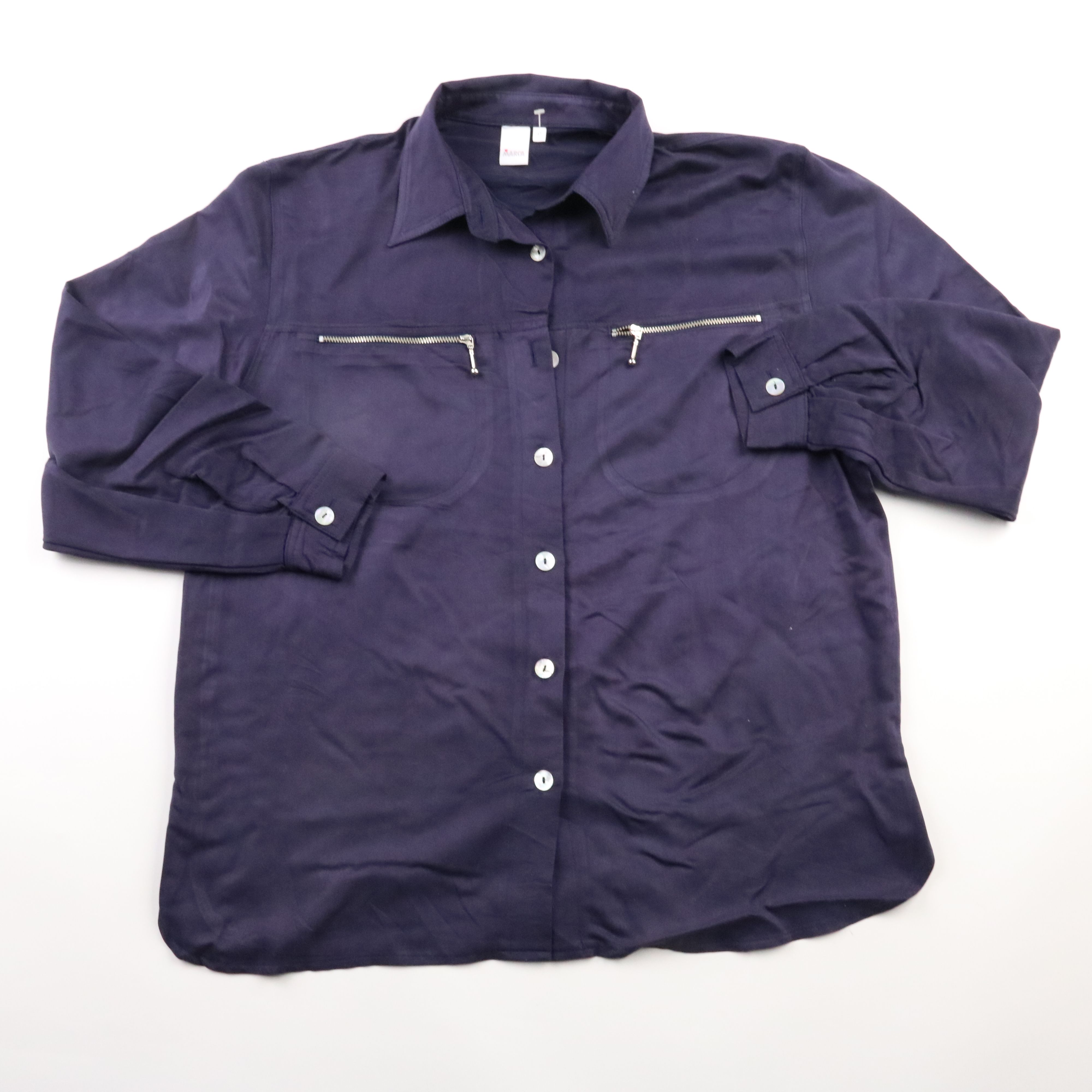Блузка Marca тёмно-синего цвета с длинными рукавами и застёжкой на пуговицы, спереди декоративные карманы на молниях. Подойдёт для офиса и повседневных образов с джинсами или брюками. Ткань на основе вискозы приятная к телу и хорошо драпируется.