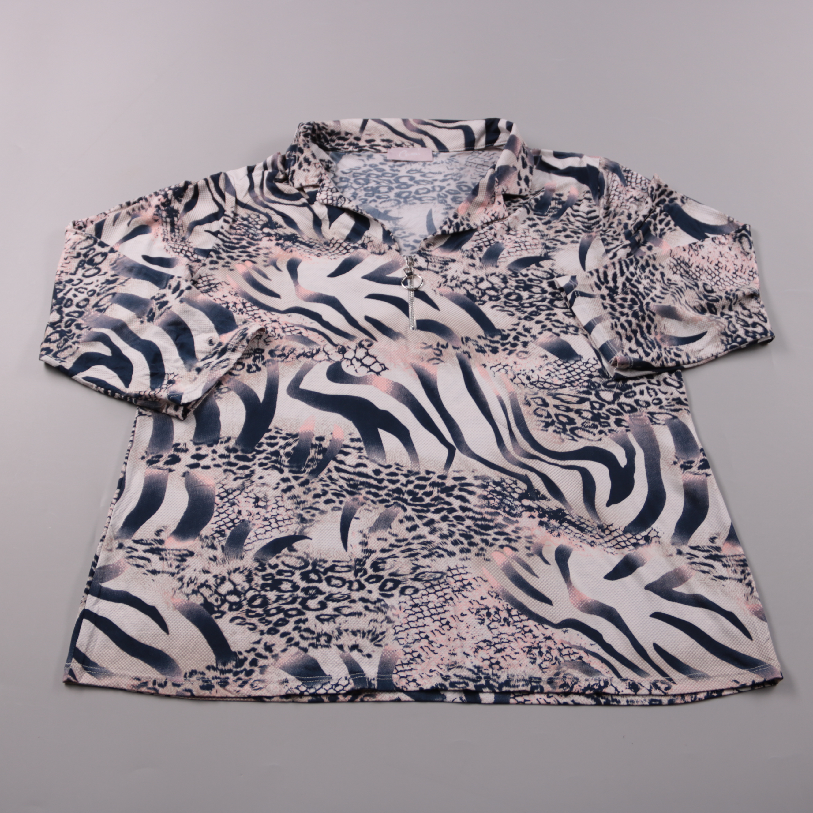 Женская блузка Cassis с коротким рукавом и небольшим воротником, с застёжкой-молнией у горловины. Подойдёт для повседневных образов и офиса в тёплую погоду, хорошо смотрится с джинсами или однотонными брюками. Практичный плюс — эластичная ткань почти н...