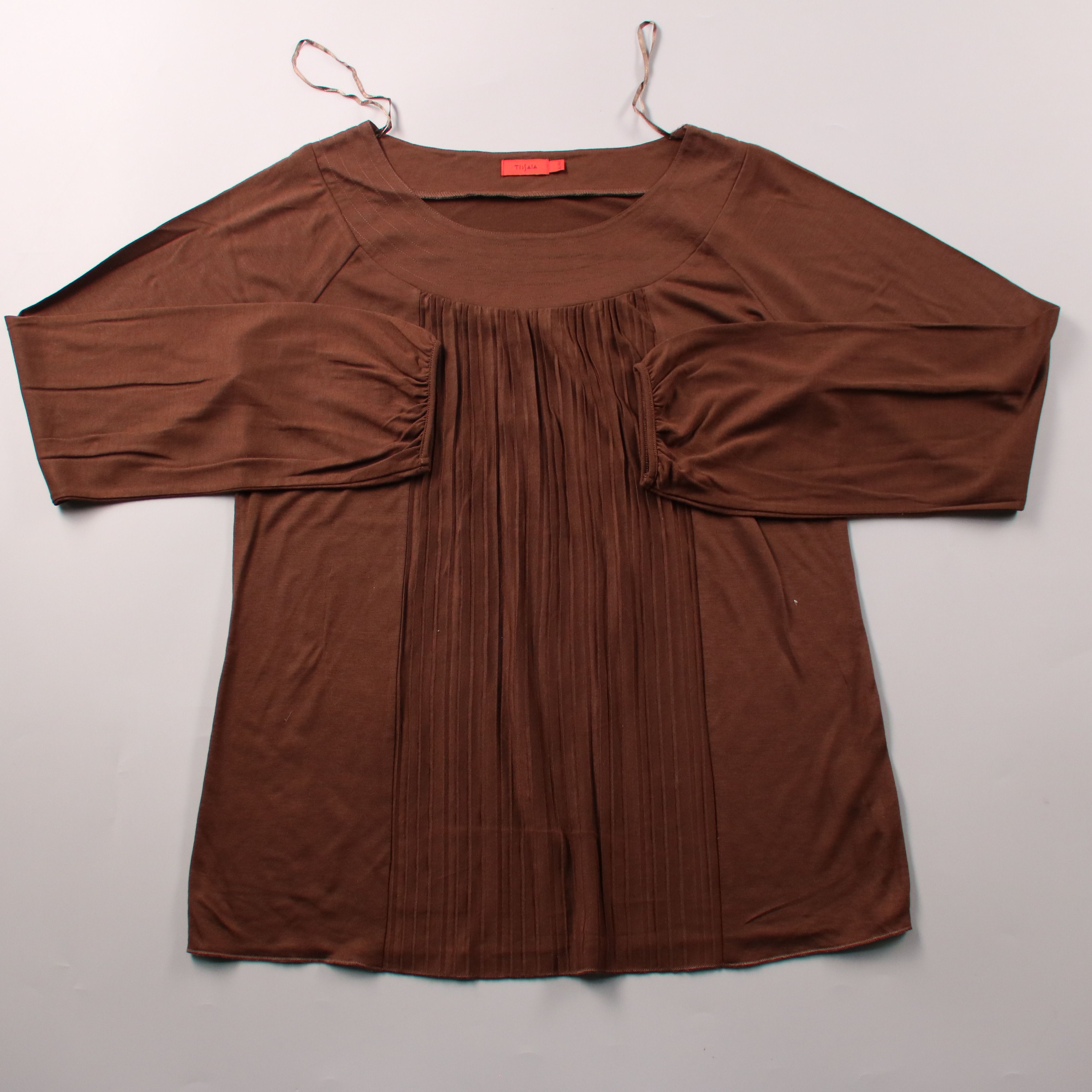 Блузка Tissaia коричневого цвета с длинным рукавом и декоративными складками спереди. Подойдёт для офиса и повседневных образов, хорошо сочетается с брюками и юбками. Смесь вискозы и полиэстера делает ткань мягкой и менее мнущейся в носке.