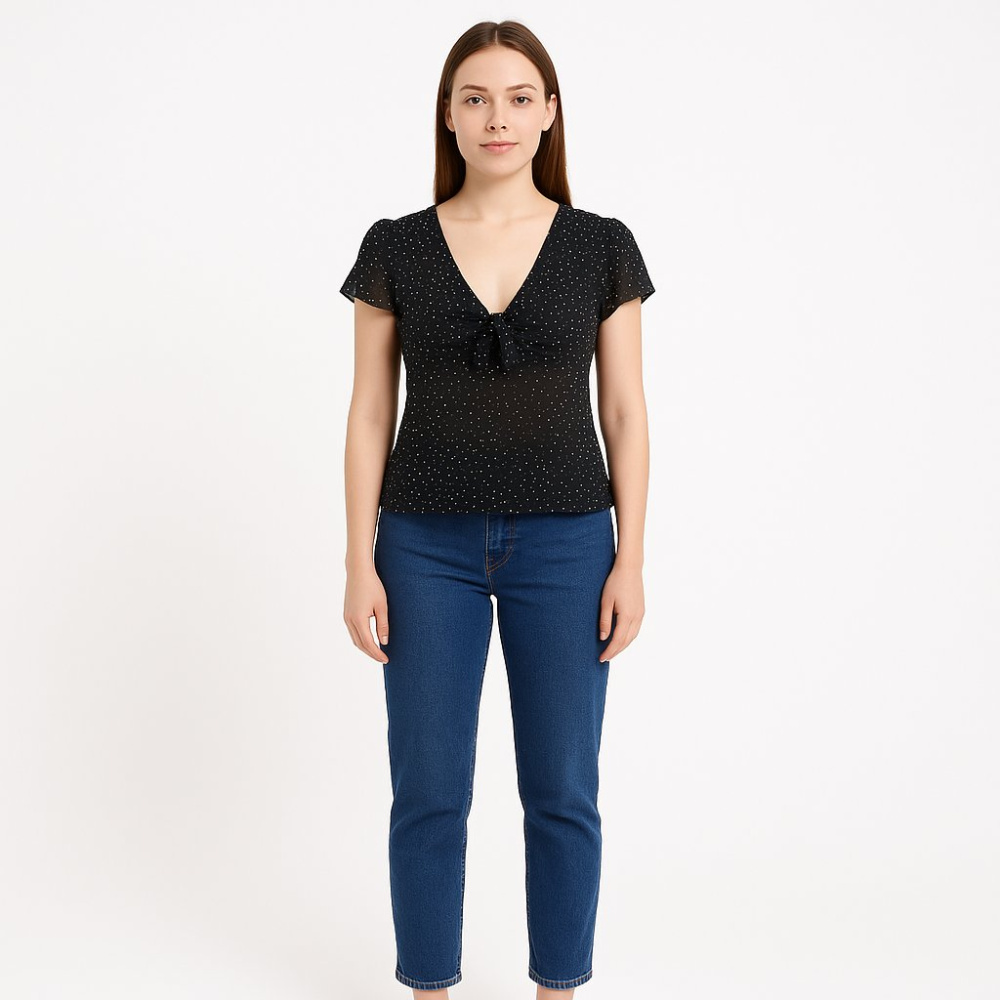 Женская чёрная блузка в мелкий белый горошек с V-образным вырезом и декоративным узлом спереди. Подойдёт для повседневных образов и офиса с жакетом в тёплое время года. Лёгкая ткань комфортна в носке и хорошо сочетается с джинсами и юбками.