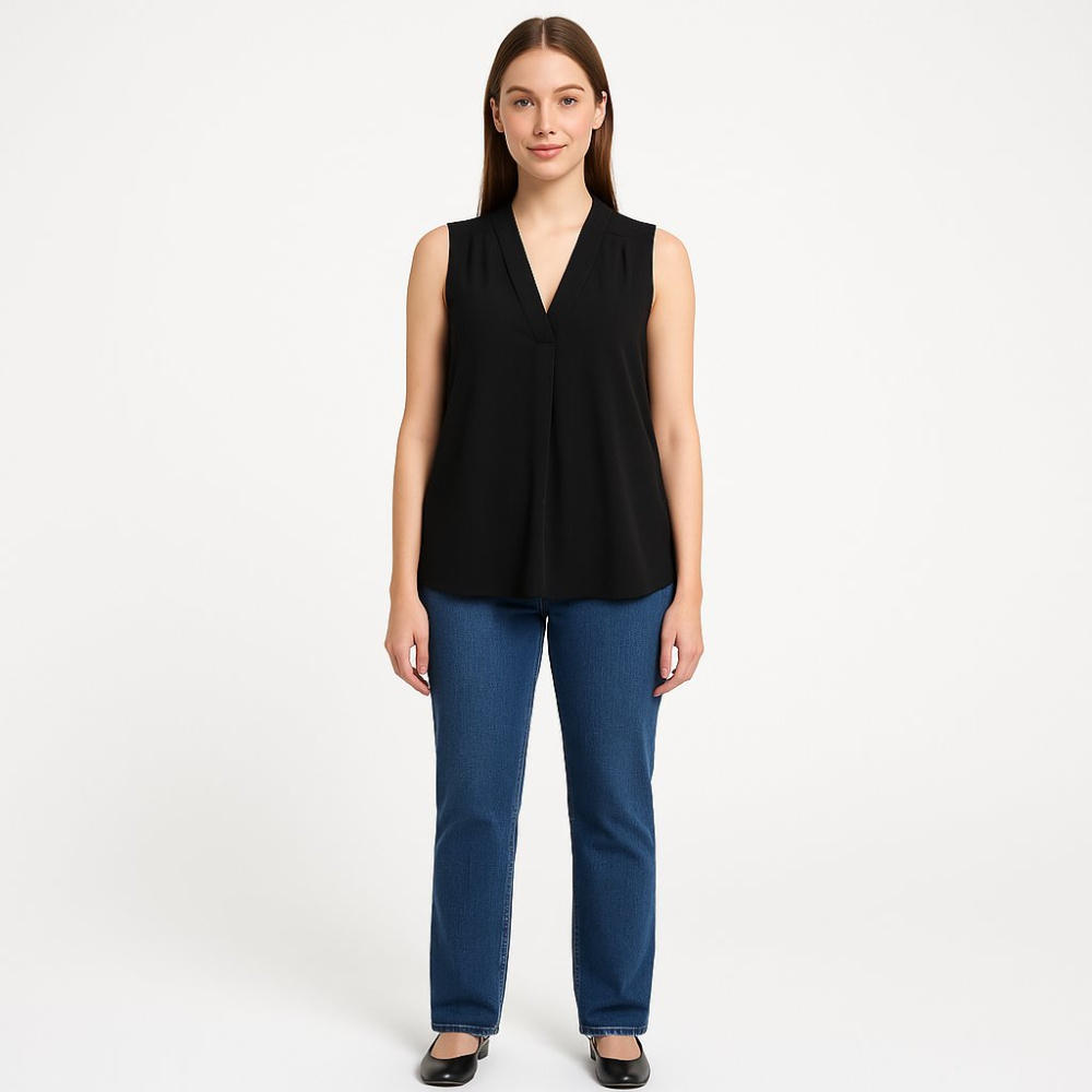 Блузка Esprit без рукавов, чёрного цвета, с V-образным вырезом и мягкой драпировкой спереди. Подойдёт для офиса и повседневных образов, легко сочетается с джинсами и брюками. Практичный плюс — лёгкая ткань из полиэстера почти не мнётся и проста в уходе.