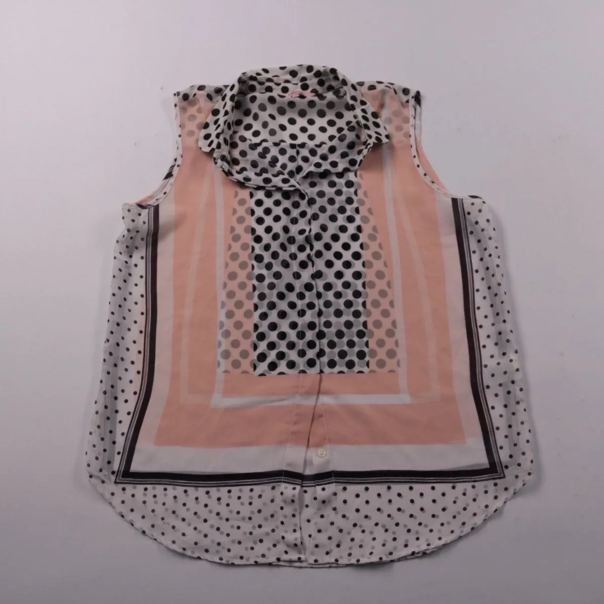 Женская блузка Next без рукавов с воротником и принтом в горох, дополнена вставками в полоску. Подойдёт для лета и тёплых помещений, хорошо смотрится с юбкой или брюками. Лёгкая ткань из полиэстера почти не мнётся и быстро сохнет.