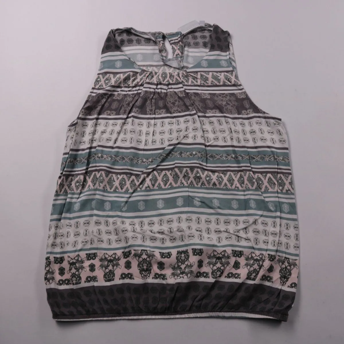 Женская блузка Trend One без рукавов с завязками у горловины и узорчатыми полосами. Подойдёт для тёплой погоды и повседневных образов с джинсами или шортами. Низ на мягкой резинке удобно фиксируется и не задирается.