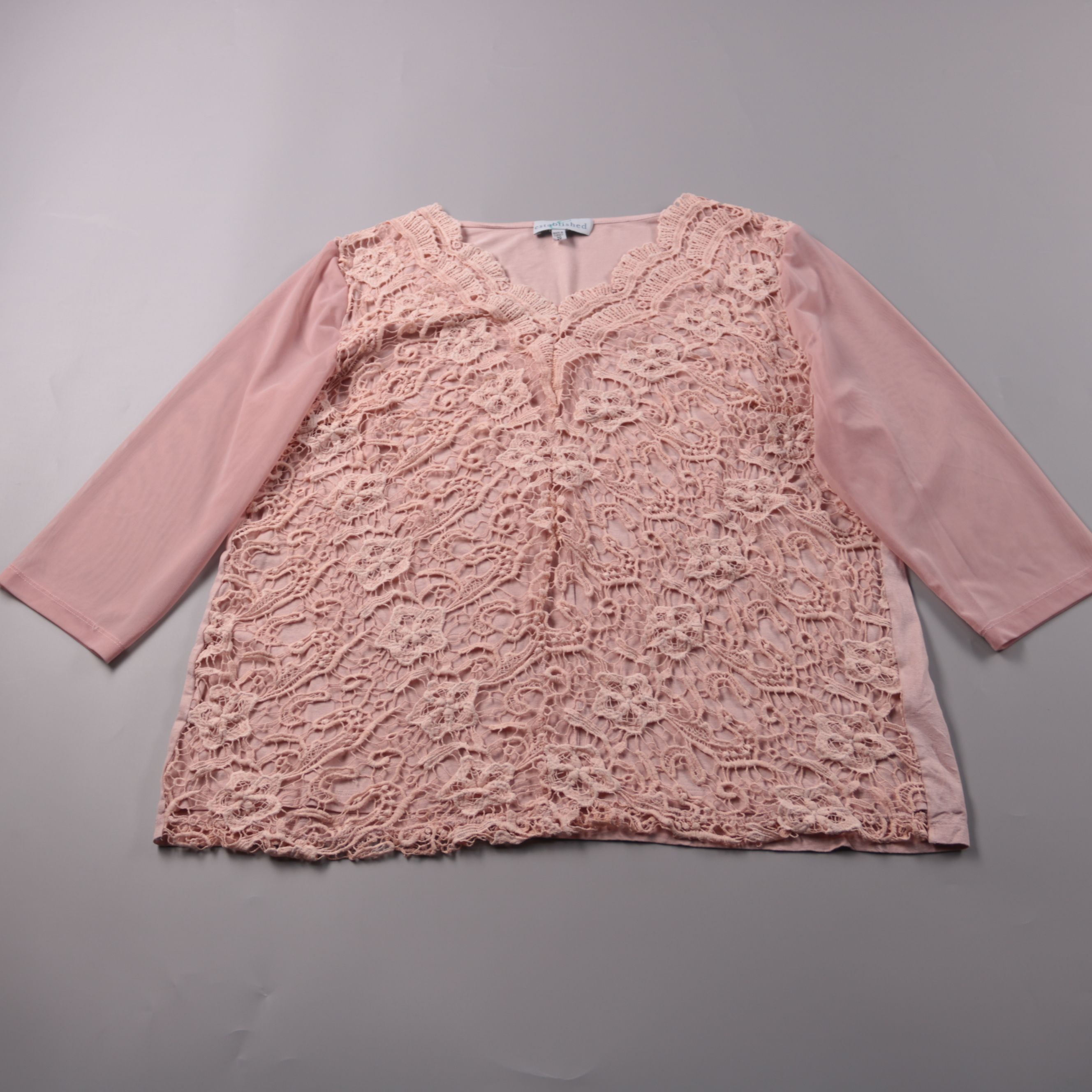 Женская блузка Established пудрово-розового цвета с кружевным передом и V-образным вырезом. Подойдёт для офиса и на выход, хорошо смотрится с брюками и юбками. Практична тем, что рукава и спинка из мягкого трикотажа комфортны в носке.