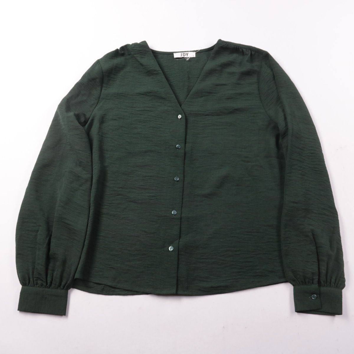 Женская блузка JDY тёмно-зелёного цвета с V-образным вырезом и застёжкой на пуговицы. Подойдёт для офиса и повседневных образов, хорошо сочетается с джинсами и классическими брюками. Лёгкая ткань и манжеты на рукавах делают посадку аккуратной и удобной.