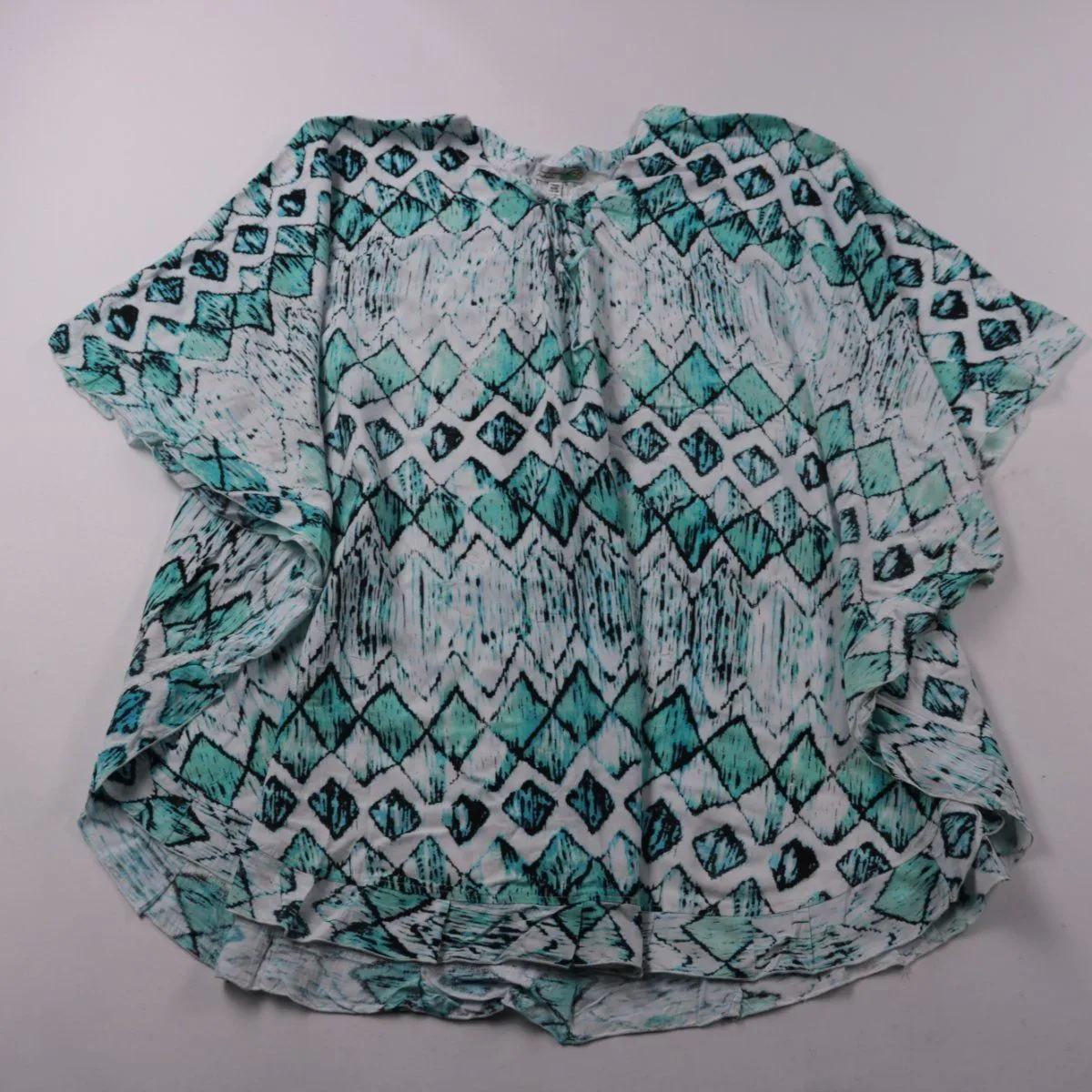 Лёгкая блузка Sandrenckel свободного кроя с широкими короткими рукавами и принтом в бирюзово-бело-чёрной гамме. Подойдёт для тёплой погоды и отдыха, хорошо смотрится с шортами или однотонными брюками. Ткань из вискозы мягкая и быстро сохнет после стирки.