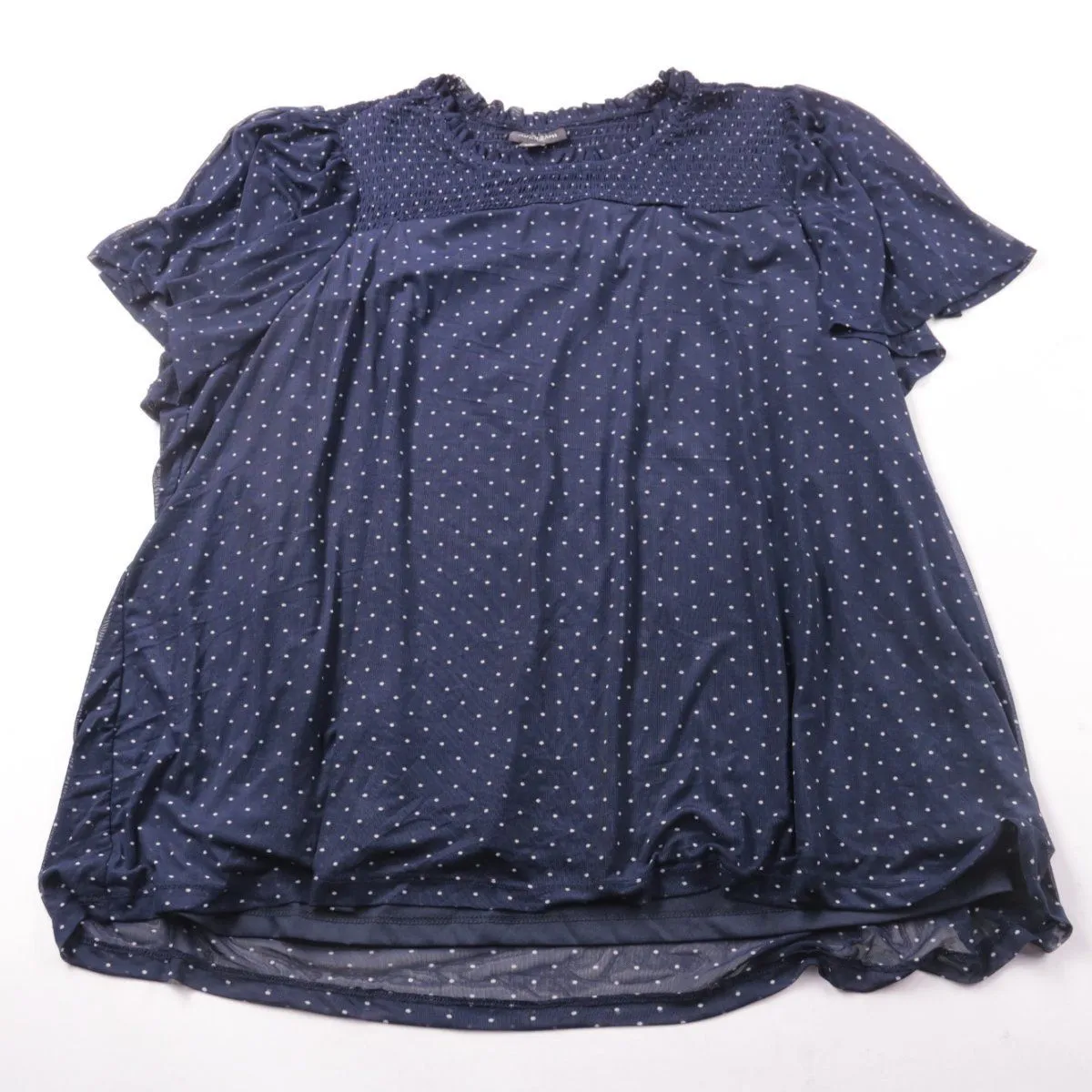 Женская блузка Autograph тёмно-синего цвета в мелкий горошек, со сборкой (smock) по кокетке и короткими рукавами. Подойдёт для повседневных образов и офиса в тёплую погоду. Ткань эластичная и не сильно мнётся.