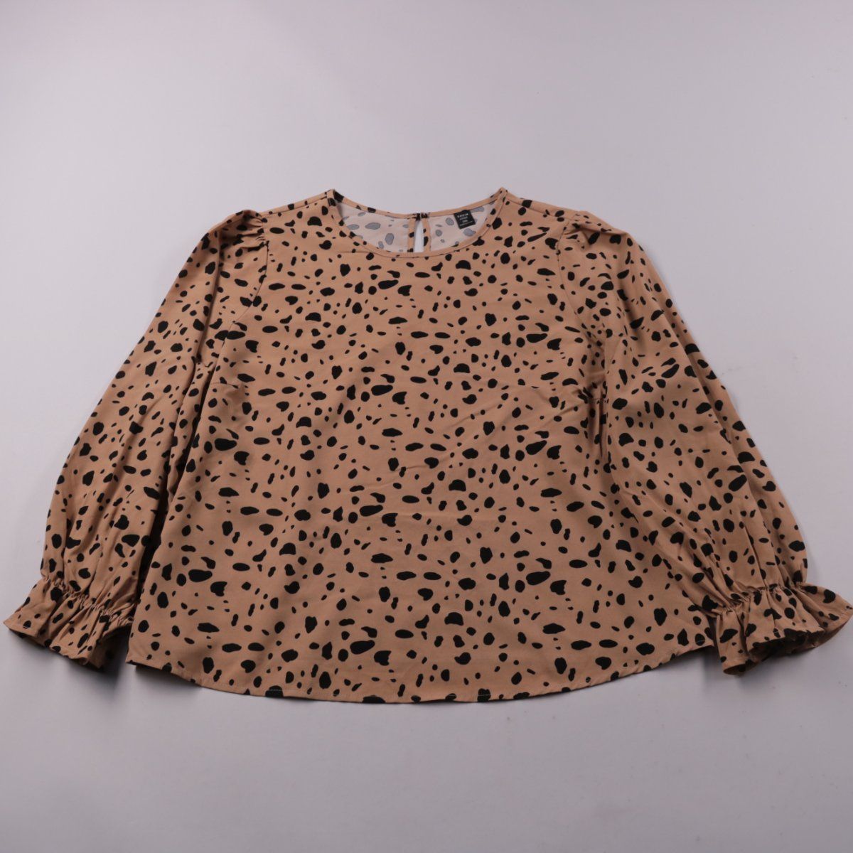 Женская блузка SHEIN CURVE бежевого цвета с чёрным пятнистым принтом и длинными рукавами на манжете с рюшей. Подойдёт для повседневных образов и офиса с базовыми брюками или юбкой. Ткань из полиэстера почти не мнётся и быстро сохнет.