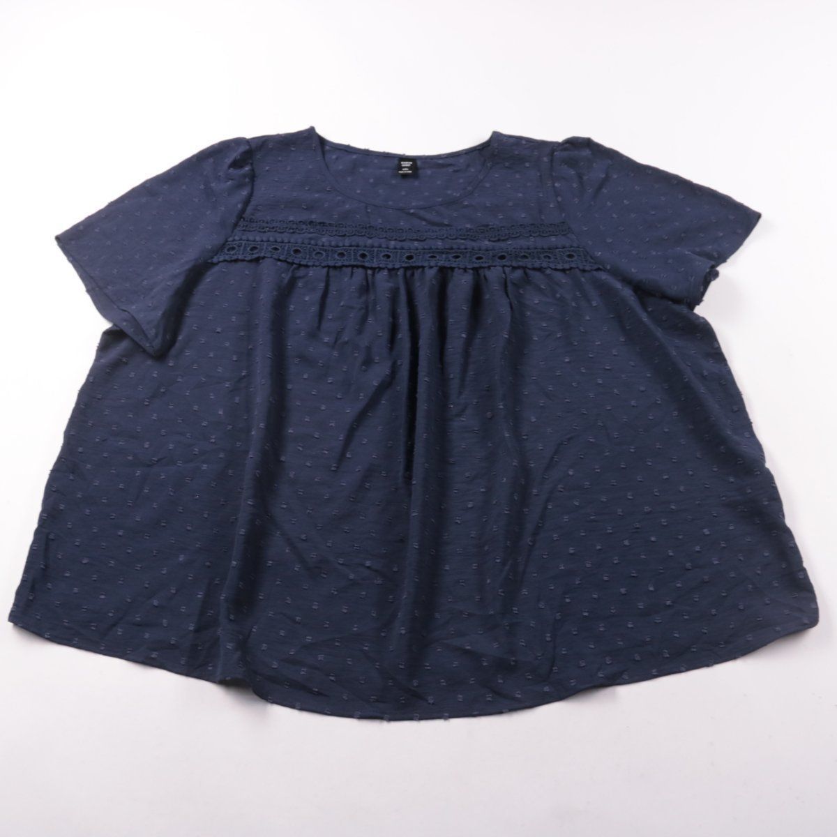 Блузка SHEIN CURVE тёмно-синего цвета из фактурной ткани с кружевной вставкой на кокетке и сборками спереди. Подойдёт для повседневных летних образов и на выход благодаря свободному силуэту. Практичный плюс — лёгкий полиэстер быстро сохнет и проще в уходе.