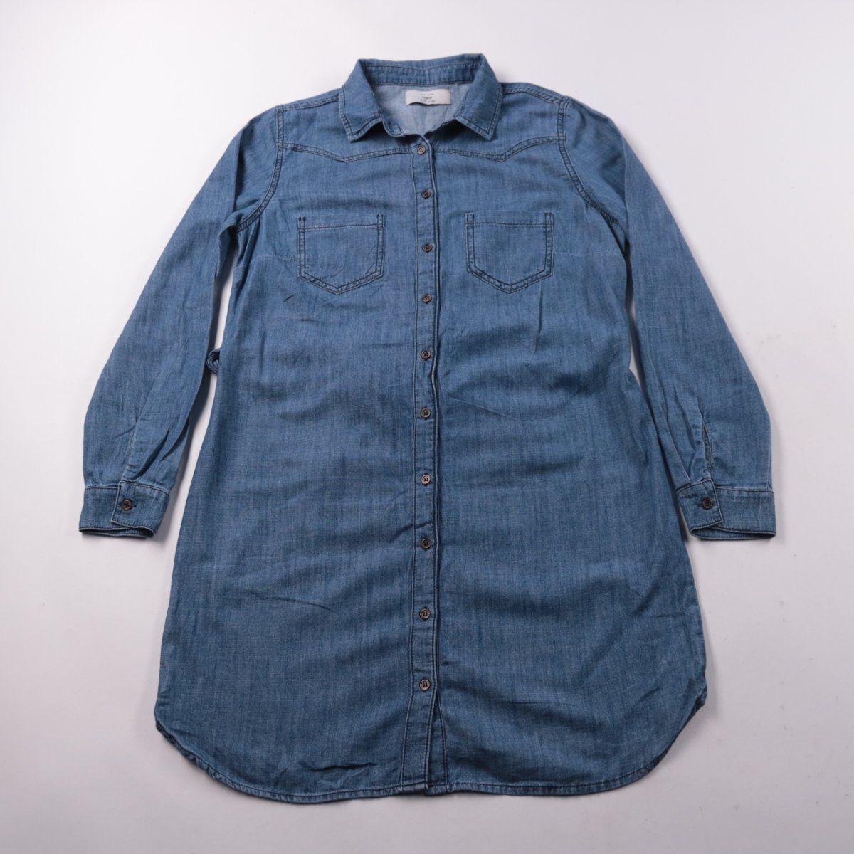 Джинсовое платье-рубашка New Look с длинным рукавом и застёжкой на пуговицы, с поясом и нагрудными карманами. Подойдёт для повседневных образов в городе и на прогулки в демисезон. Плотный деним хорошо держит форму и легко сочетается с кедами или ботинками.