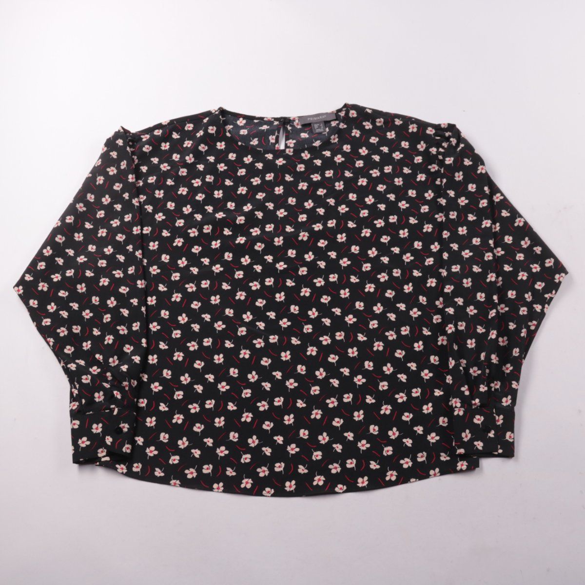 Женская блузка Primark чёрного цвета с мелким цветочным принтом и круглым вырезом. Подойдёт для офиса и повседневных образов, хорошо сочетается с однотонным низом. Лёгкий полиэстер почти не мнётся и быстро сохнет.