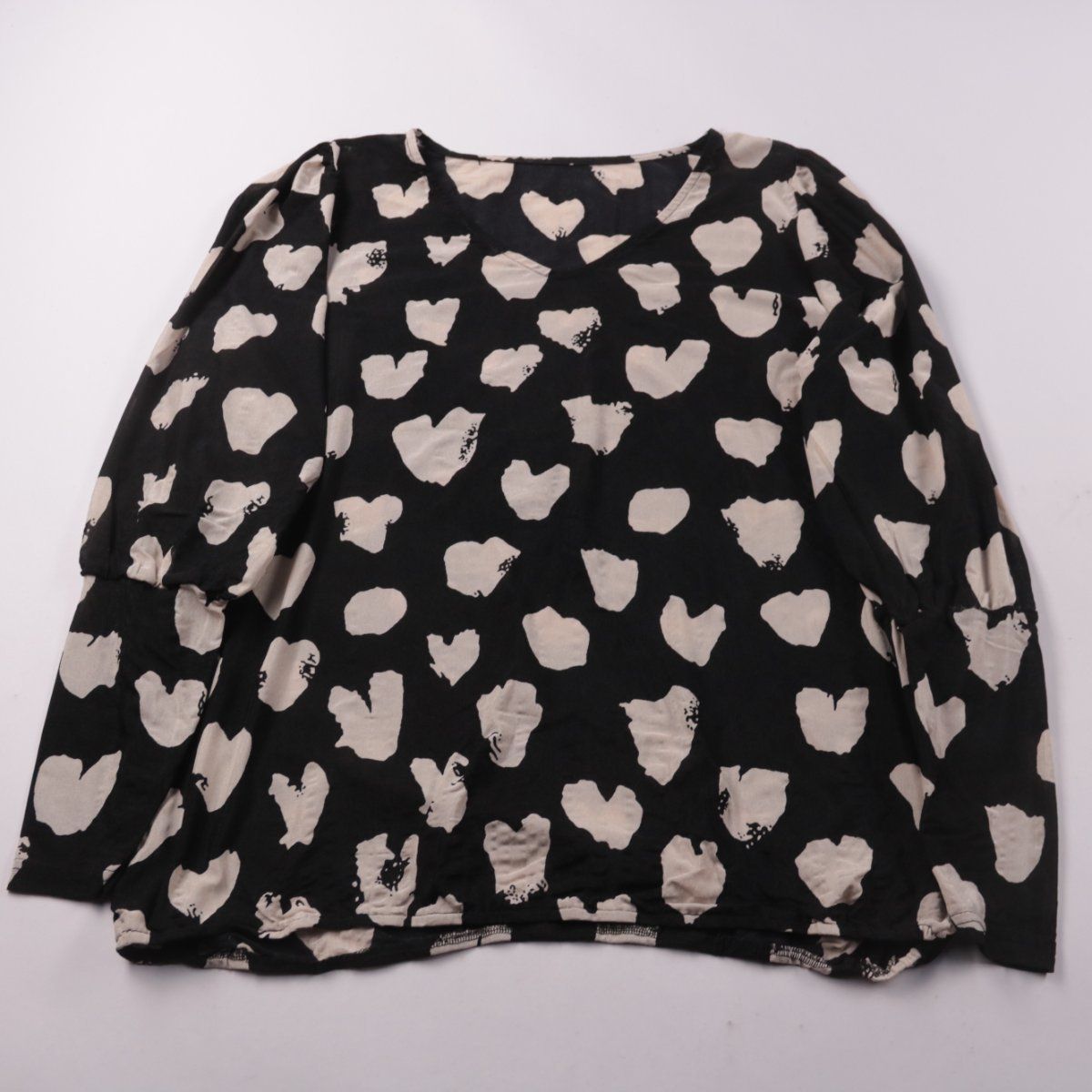 Женская блузка с V-образным вырезом и принтом в виде сердец на чёрном фоне. Подойдёт для повседневных образов и офиса с жакетом или кардиганом. Материал 100% нейлон — лёгкая ткань, которая быстро сохнет и проста в уходе.