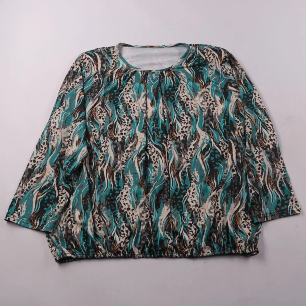 Женская блузка свободного кроя с длинным рукавом и ярким абстрактно-анималистичным принтом. Подойдёт для повседневных образов и офиса в сочетании с брюками или юбкой. Эластичный низ помогает блузке аккуратно сидеть и не задираться.