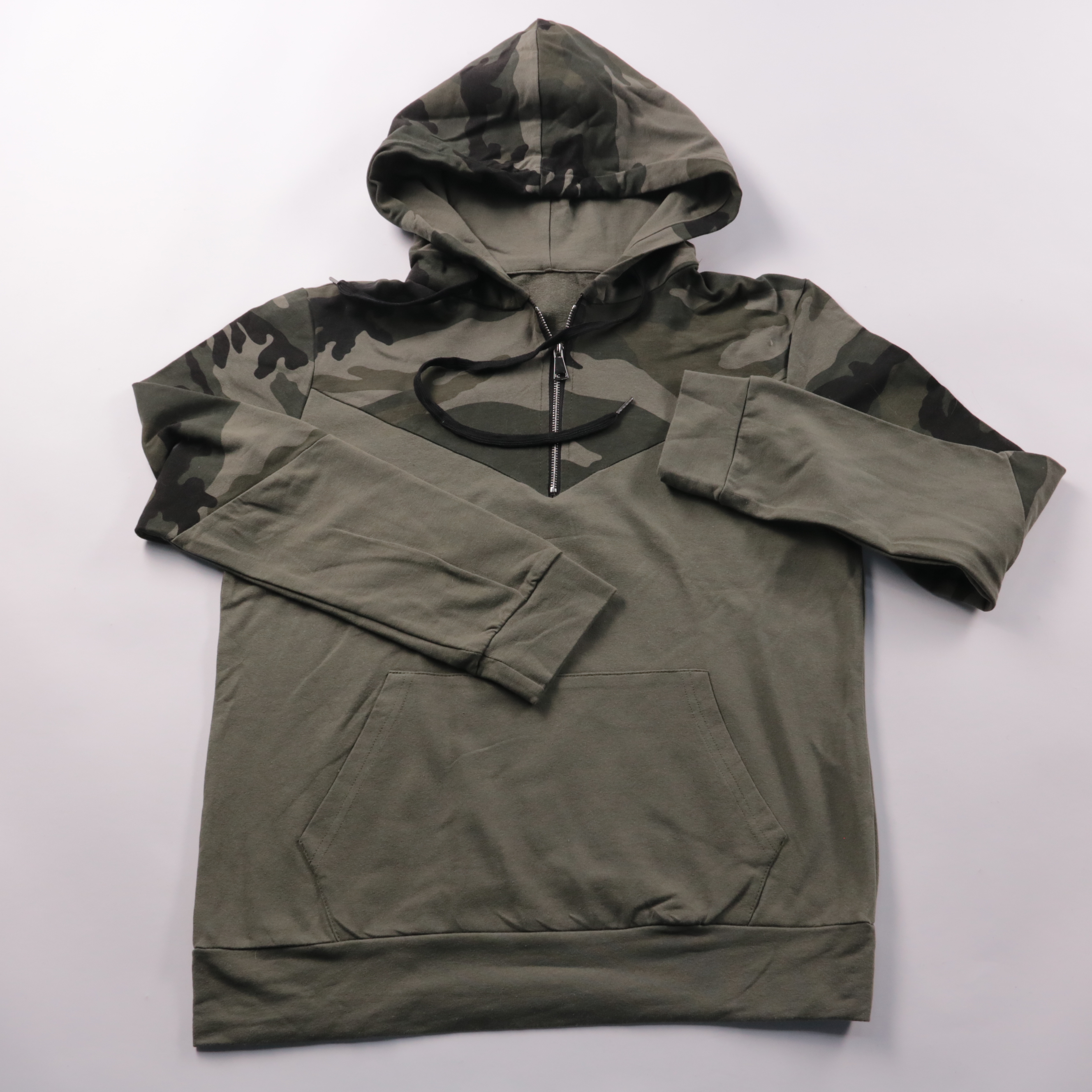 Толстовка Pax цвета хаки с камуфляжными вставками на плечах и капюшоне, есть короткая молния и карман-кенгуру. Подойдёт для прогулок и повседневной носки в прохладную погоду, удобная посадка не сковывает движения. Практичное преимущество — капюшон защи...