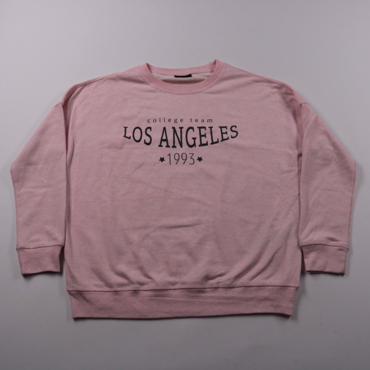 Женский свитшот Janina в нежно-розовом цвете с принтом «Los Angeles 1993». Подойдёт для повседневных образов и прогулок в прохладную погоду, хорошо сочетается с джинсами и спортивными брюками. Практичный мягкий трикотаж и удобные манжеты делают посадку комфортной.