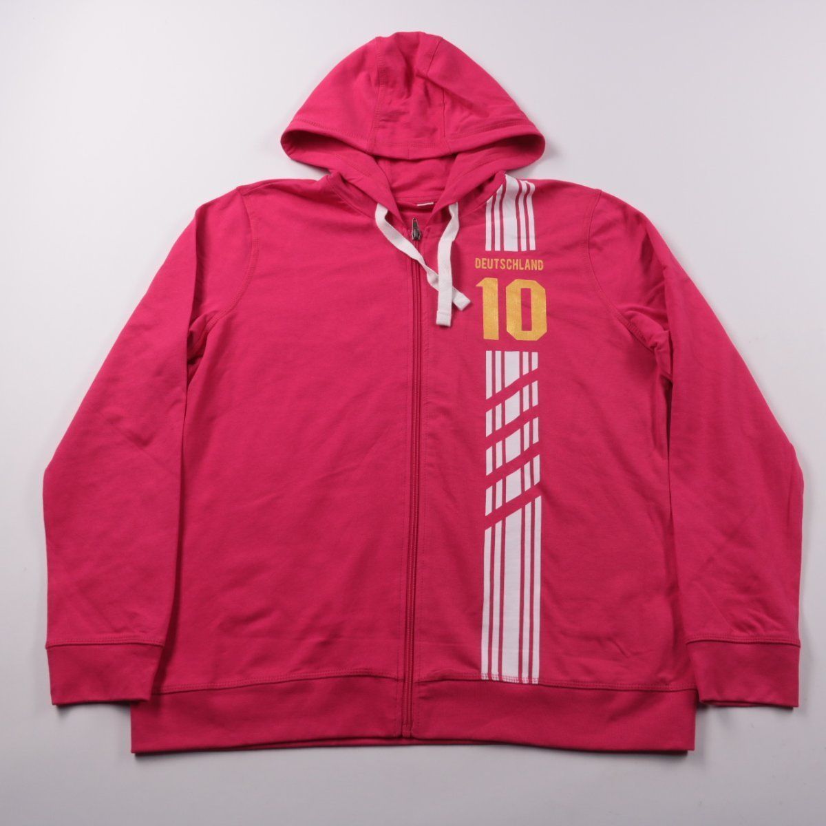 Толстовка на молнии с капюшоном и шнурком, с принтом «DEUTSCHLAND 10» и полосами. Подойдёт для повседневной носки и прогулок в прохладную погоду, можно носить как слой под куртку. Практична тем, что застёгивается на молнию и выполнена из хлопковой смеси.