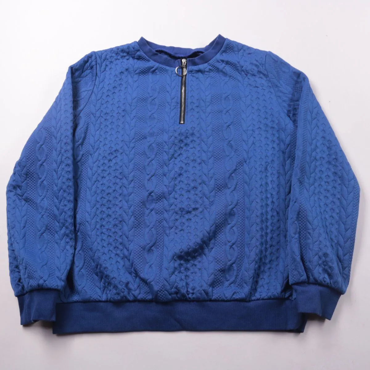 Свитшот без капюшона с короткой молнией у горловины и фактурным узором. Подойдёт для повседневных образов в прохладную погоду и для офиса в стиле casual. Материал тянется и хорошо держит форму.