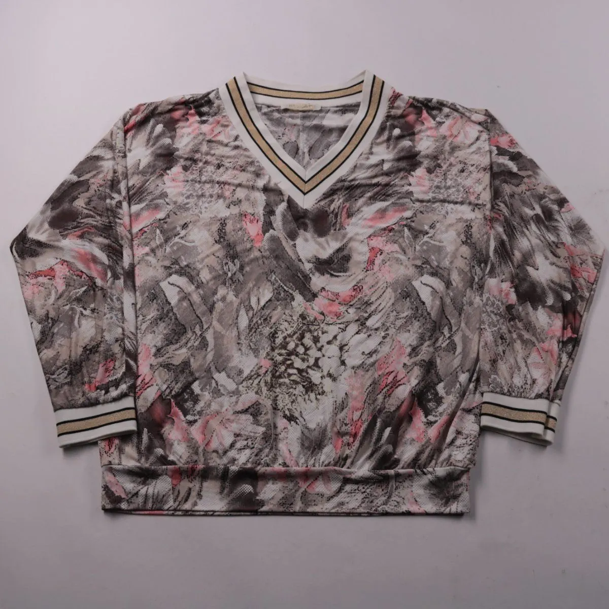 Женский свитшот Obelia с V-образным вырезом и принтованной расцветкой. Подойдёт для повседневных образов и офиса в стиле casual, хорошо сочетается с джинсами и брюками. Материал с эластаном немного тянется и комфортно садится по фигуре.