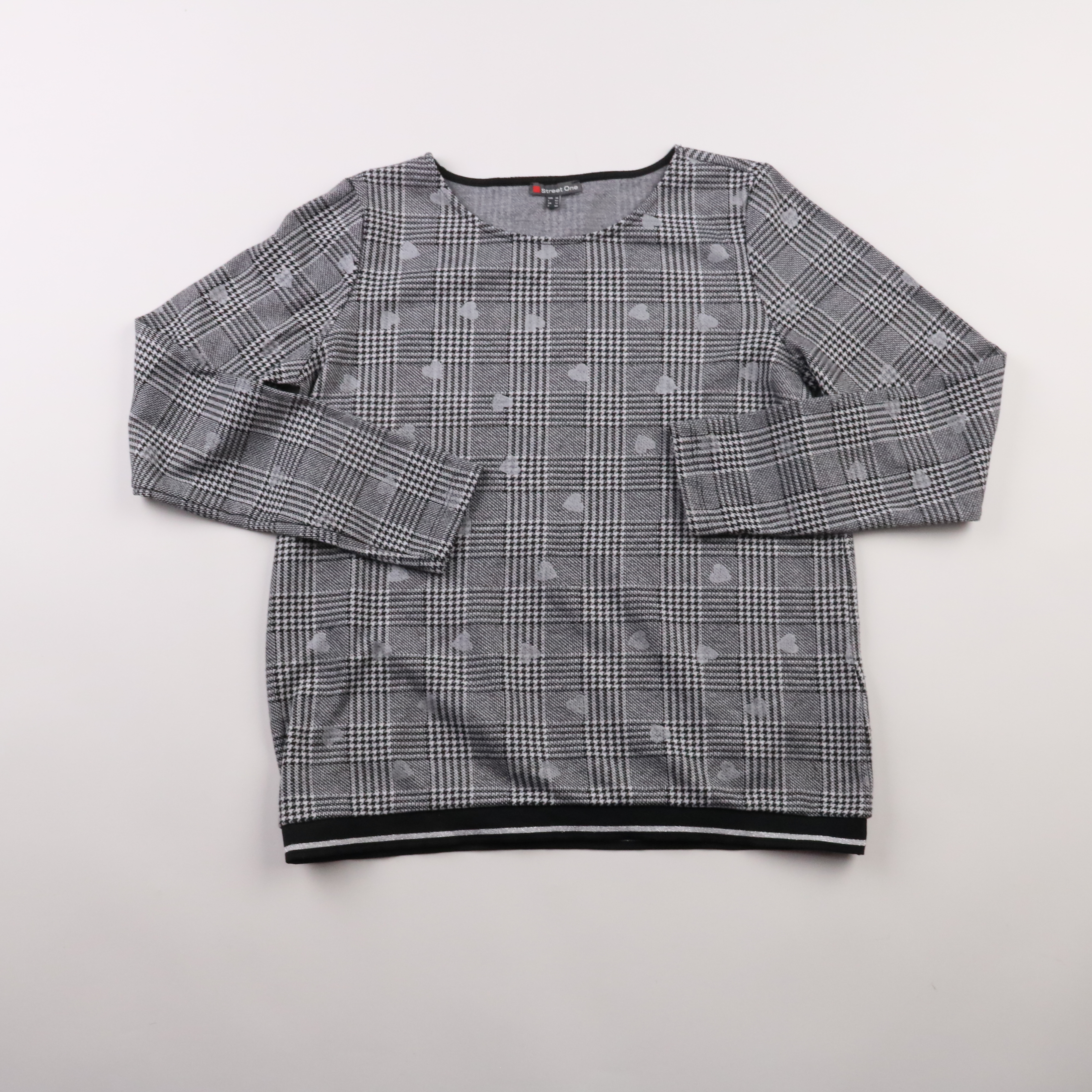 Женский лонгслив Street One в серую клетку с ненавязчивым узором, круглый вырез и длинный рукав. Подойдёт для повседневных образов в офис или на прогулку, легко сочетается с джинсами и брюками. Трикотаж с вискозой мягкий и приятный к телу, немного тяне...