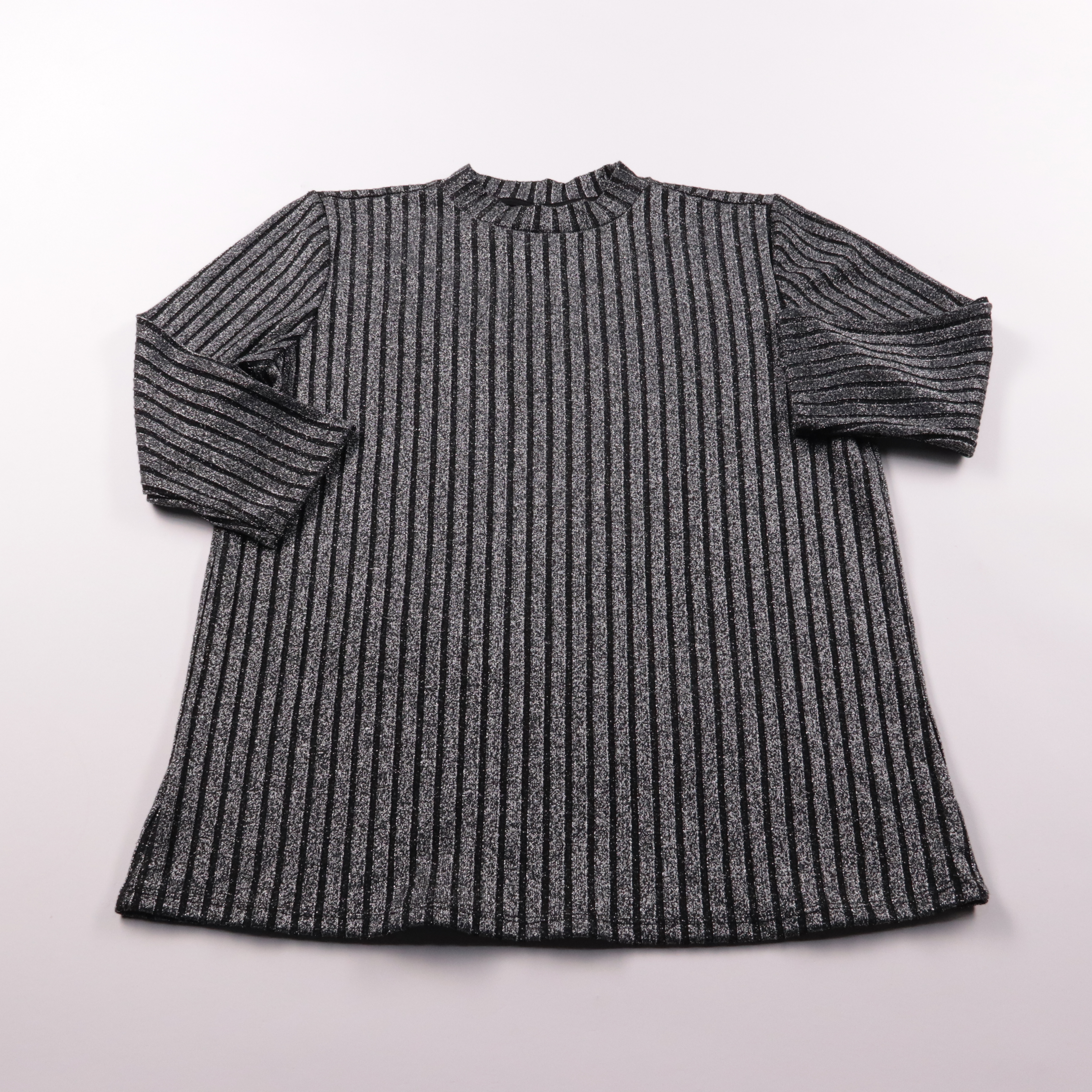 Лонгслив Yessica из трикотажа в рубчик с серебристым люрексом и вертикальной полоской. Подойдёт для вечерних выходов и на каждый день с джинсами или юбкой. Ткань тянется и комфортно садится по фигуре, не сковывает движения.