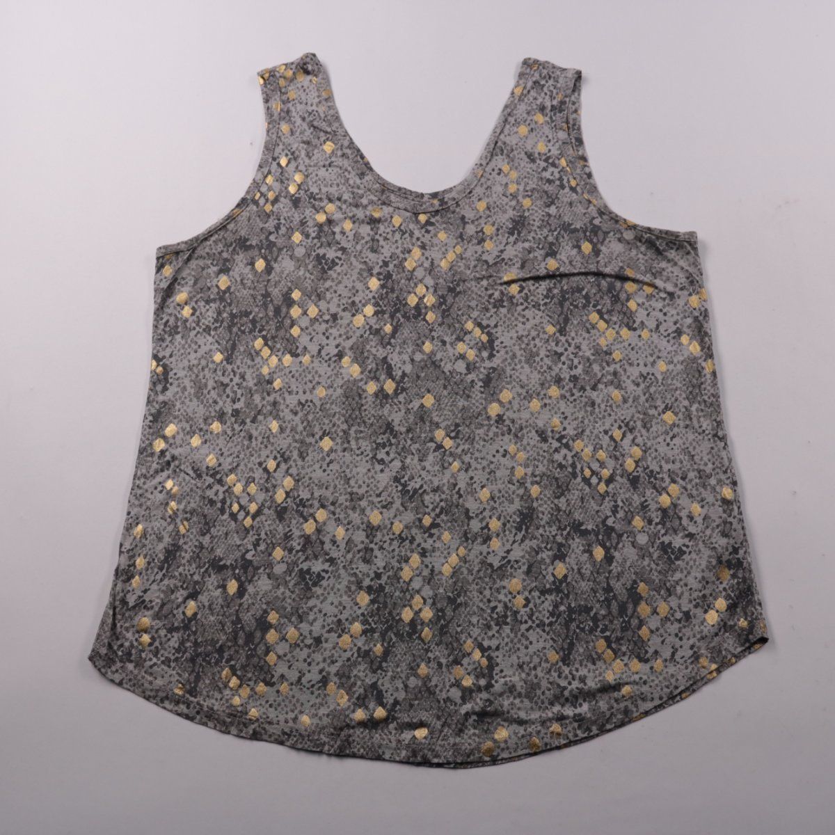 Женская майка Next из вискозы серого цвета с золотистым узором и небольшим декоративным элементом на груди. Подойдёт для лета и тёплой погоды, удобно носить с джинсами, шортами или юбкой. Лёгкая ткань хорошо дышит и комфортна в носке.