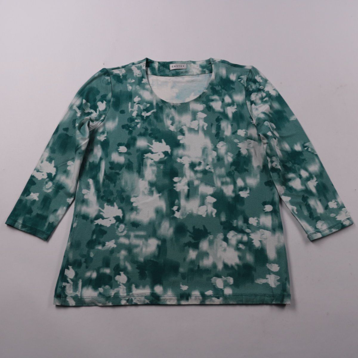 Женский лонгслив Eastex с округлым вырезом и абстрактным принтом в зелёно-белых тонах. Подойдёт для повседневных образов и офиса с жакетом или кардиганом. Тянущаяся вискоза с добавлением эластана комфортно садится по фигуре.