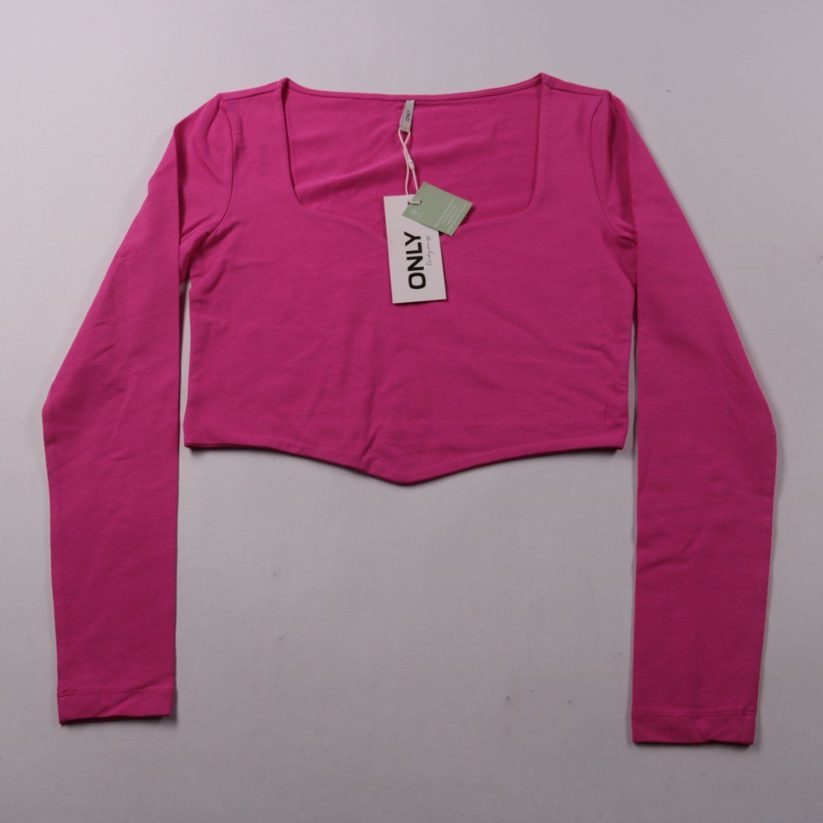 Женский укороченный лонгслив ONLY ярко-розового (Fuchsia Purple) цвета с квадратным вырезом и длинными рукавами. Подойдёт для повседневных образов и в качестве слоя под жакет или куртку. Трикотаж с эластаном хорошо тянется и комфортно садится по фигуре.