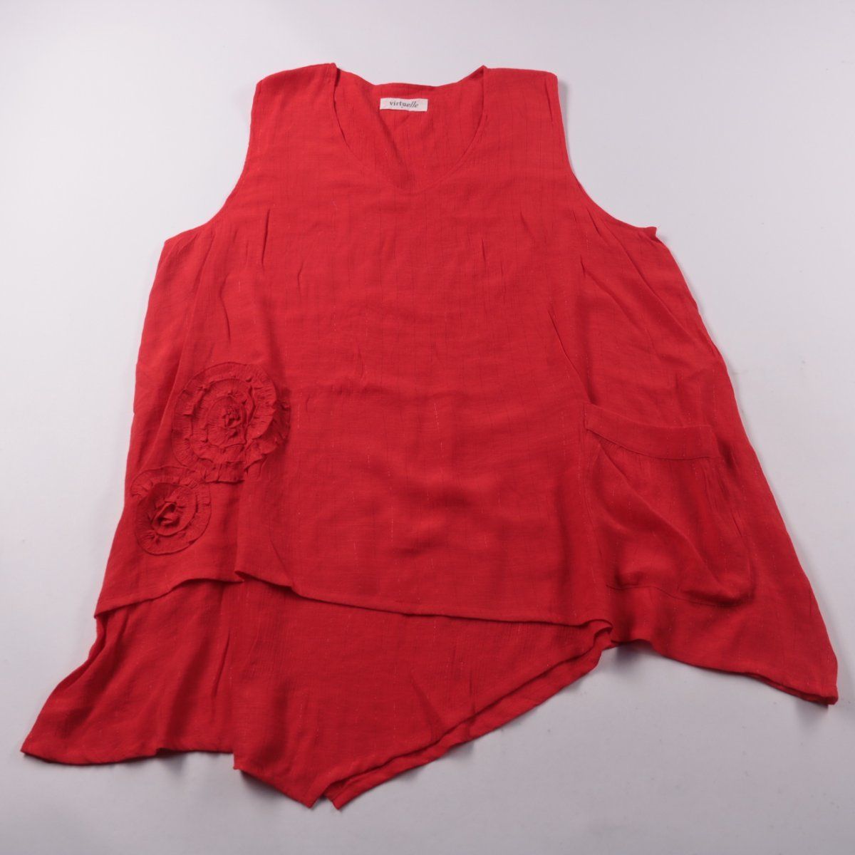 Топ Virtuelle красного цвета без рукавов, с V-образным вырезом и свободным силуэтом. Подойдёт для тёплой погоды и многослойных образов, есть декоративная аппликация сбоку. Лёгкая ткань с добавлением люрекса даёт небольшой блеск и хорошо драпируется.